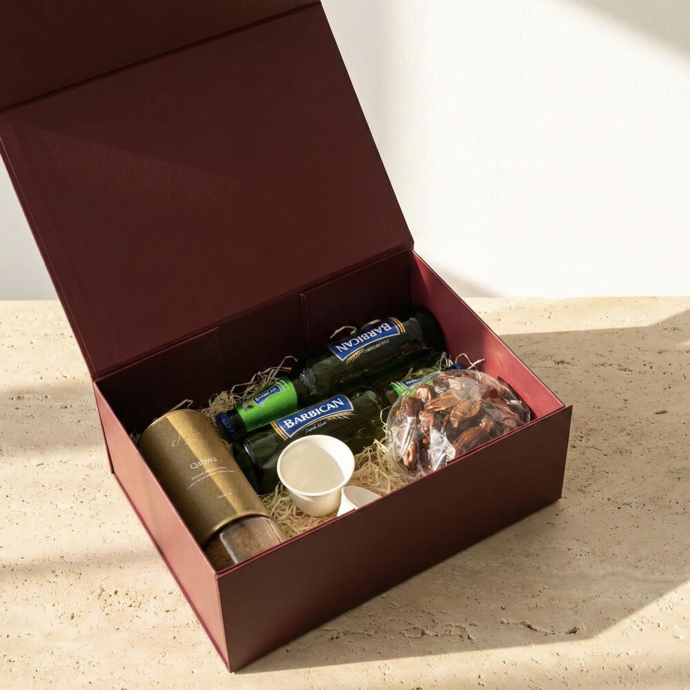 Celebra el Ramadán con el Golden Iftar Refresh Box, una refinada mini cesta de Iftar que reúne tradición, calidez y frescura en una presentación elegante. Diseñada cuidadosamente para regalos corporativos de Ramadán, cestas VIP y para acoger Iftars familiares, esta caja de lujo ofrece una experiencia completa de hospitalidad ramadánica. En el interior de la cesta premium estructurada encontrarás dátiles premium naturalmente dulces para un Iftar al estilo Sunnah, una lujosa mezcla de café árabe Qahwa, dos elegantes tazas de café para un servicio auténtico y dos botellas de bebida de malta Barbican para un final refrescante. Diseñado para equilibrar dulzura, calidez y frescor, este set de regalo para Ramadán refleja generosidad, tradición y gusto refinado — lo que lo hace ideal para reuniones vespertinas significativas.