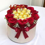 Celebre el amor con esta encantadora y lujosa caja de regalo que combina la belleza de las flores frescas con el placer del chocolate fino. Un anillo de exuberantes rosas rojas rodea bombones Ferrero Rocher dorados, delicadamente decorado con ramitas de gitano para un toque suave y romántico. El arreglo se presenta elegantemente en una sombrerera redonda color crema con un elegante lazo de satén, lo que lo convierte en un regalo perfecto. Ya sea para San Valentín, un aniversario o una dulce sorpresa, esta caja expresa tus sentimientos con dulzura y estilo. El adorno decorativo "Love You" añade un toque final conmovedor. Es un regalo que deleitará tanto la vista como el paladar. Una romántica caja redonda con 12 rosas rojo intenso que rodean 16 bombones Ferrero Rocher, adornadas con gitano y un lazo de satén rojo.