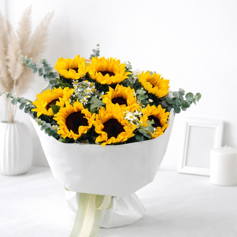 Descripción: 8 girasoles 5 tallos de manzanilla 5 tallos de eucalipto Envuelto en papel blanco y atado con cinta blanca