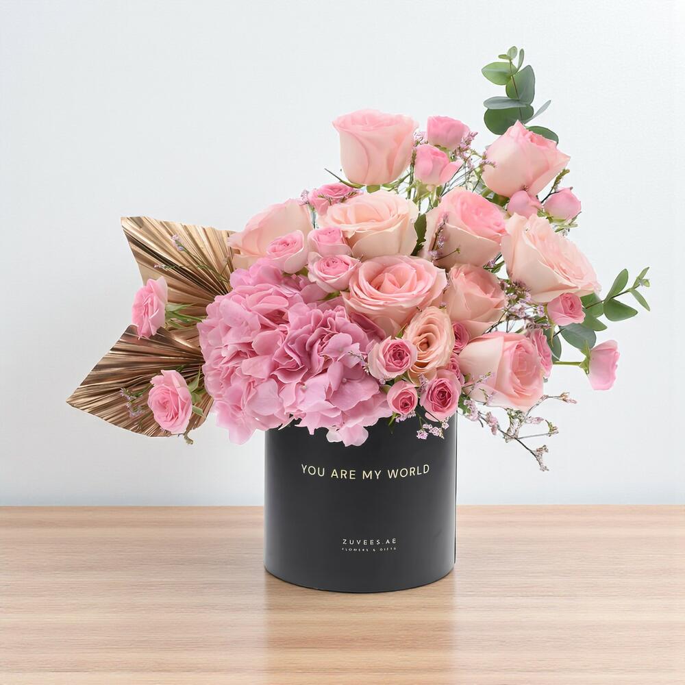 Demuestra tu amor de la manera más significativa con la Caja My World Rosa Dorada: una lujosa caja negra repleta de rosas Esperance, rosas en spray, hortensias y detalles dorados. Diseñado para capturar la pasión y la ternura, este arreglo simboliza una profunda devoción y es la manera perfecta de recordarle a esa persona especial que realmente significa mucho para ti.