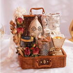 Celebra la esencia del Ramadán con esta hermosa cesta tipo maletín de color marrón, cuidadosamente curada y diseñada para combinar espiritualidad, tradición y una presentación elegante. Este arreglo refinado incluye una alfombra de oración con cuentas de oración cuidadosamente guardadas en una bolsa, simbolizando la reflexión y la devoción durante el mes sagrado. Una linterna metálica decorativa de Ramadán y un incensario aportan un ambiente cálido y aromático, mientras que frascos de vidrio transparentes contienen dátiles clásicos y bakhoor para un toque tradicional. Acentuada con rosas rojas artificiales, flores secas, relleno de eucalipto y rematada con elementos de envoltorio premium y cinta, esta cesta es una opción de regalo significativa y elegante para el Ramadán.