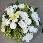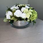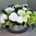 orchid cymbidium - 2 ud. cala - 1 ud. garden rose - 3 ud. rosa clásica - 9 ud. rosa romántica - 9 ud. mezcla de follaje - 10 ud. hortensia verde - 1 ud.