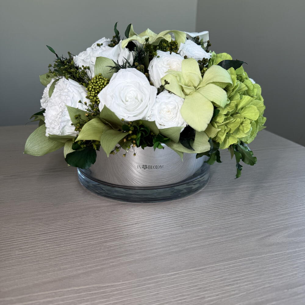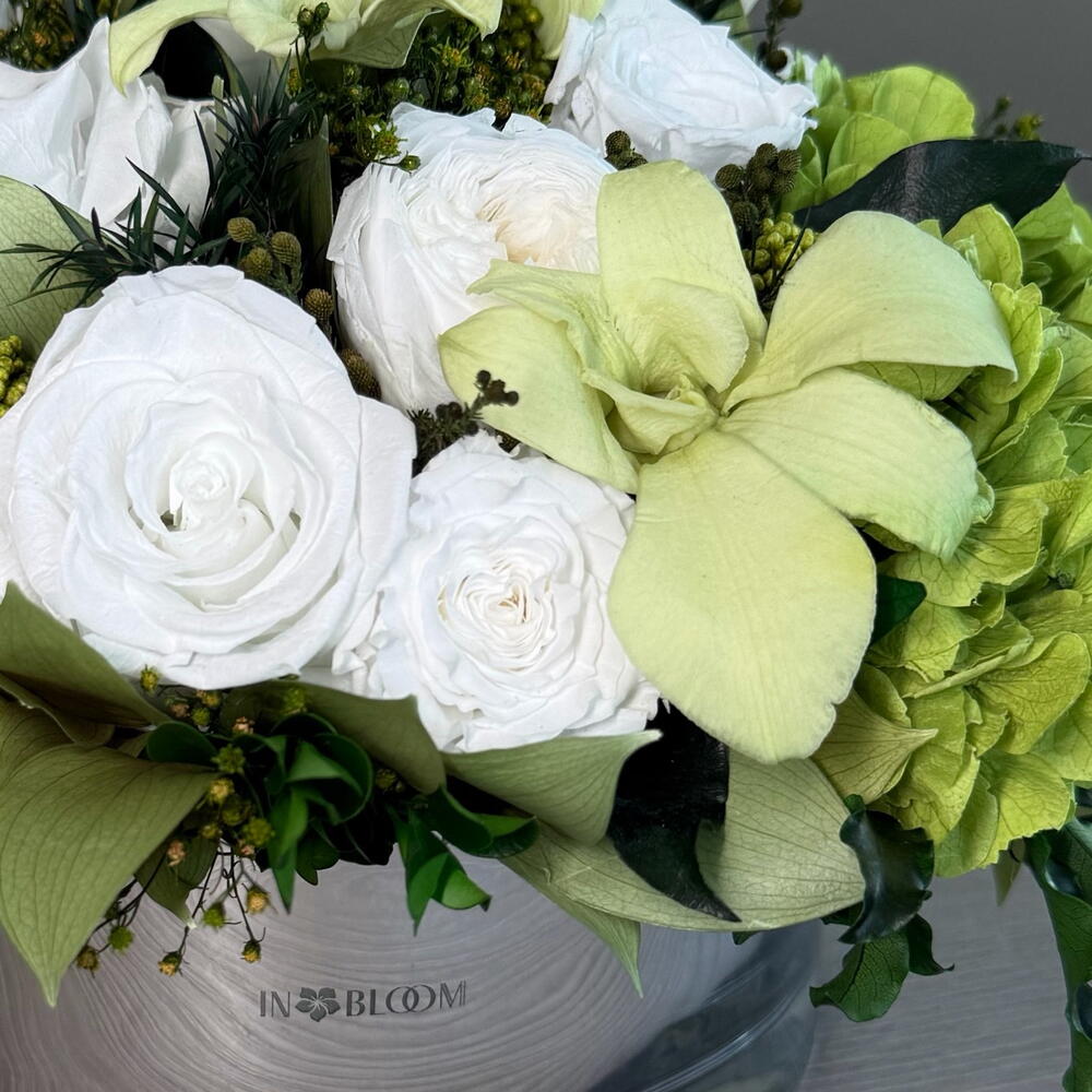 ✨ Flores naturales que duran un año ✨ Grace es una delicada celebración del arte floral, que combina un delicado romance con una elegancia atemporal. Con rosas, orquídeas y hortensias premium biopreservadas, este arreglo se complementa con rusco italiano y hojas de hiedra para una composición con una fluidez natural. Esta pieza está elaborada exclusivamente con flores 100 % naturales biopreservadas para que duren hasta un año sin necesidad de agua ni mantenimiento. Cada arreglo está diseñado con amor por nuestros floristas. 🌺