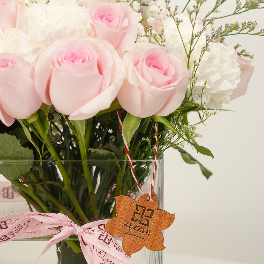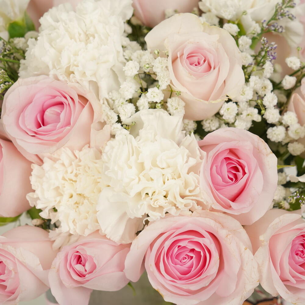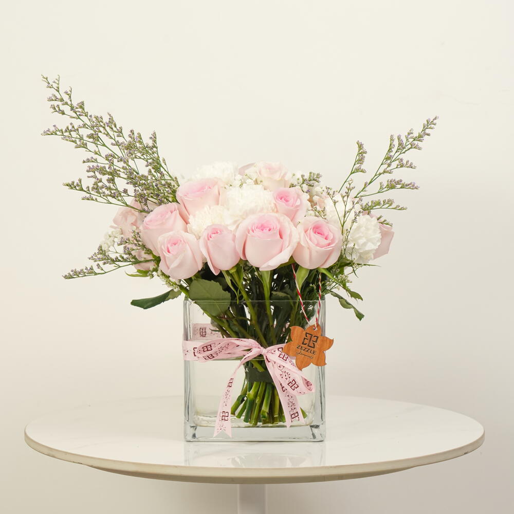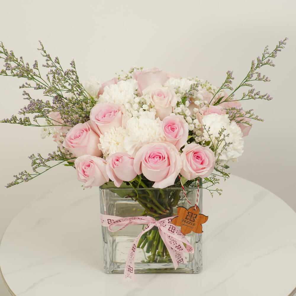 Un arreglo refinado de 10 claveles blancos puros y 10 delicadas rosas rosadas, bellamente presentado en un jarrón cuadrado de vidrio. Graceful Duo simboliza la elegancia y la armonía, lo que lo convierte en el regalo floral perfecto para el amor, la gratitud o las ocasiones especiales.