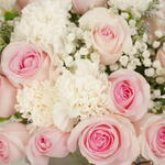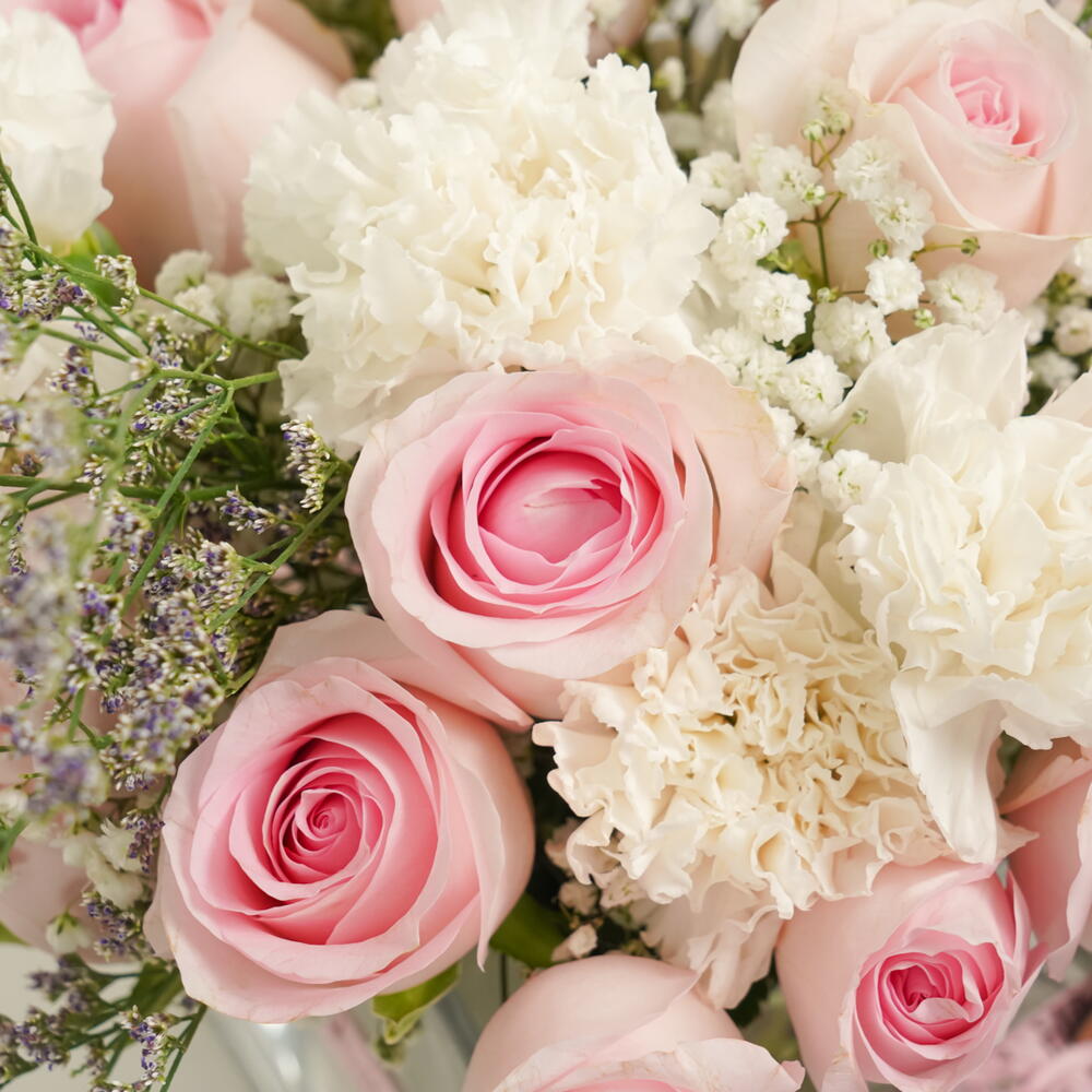 rose pink - 20 ud. clavel blanco - 10 ud. limonium purple - 5 ud. gypso blanco - 10 ud. jarrón cuadrado - 1 ud.