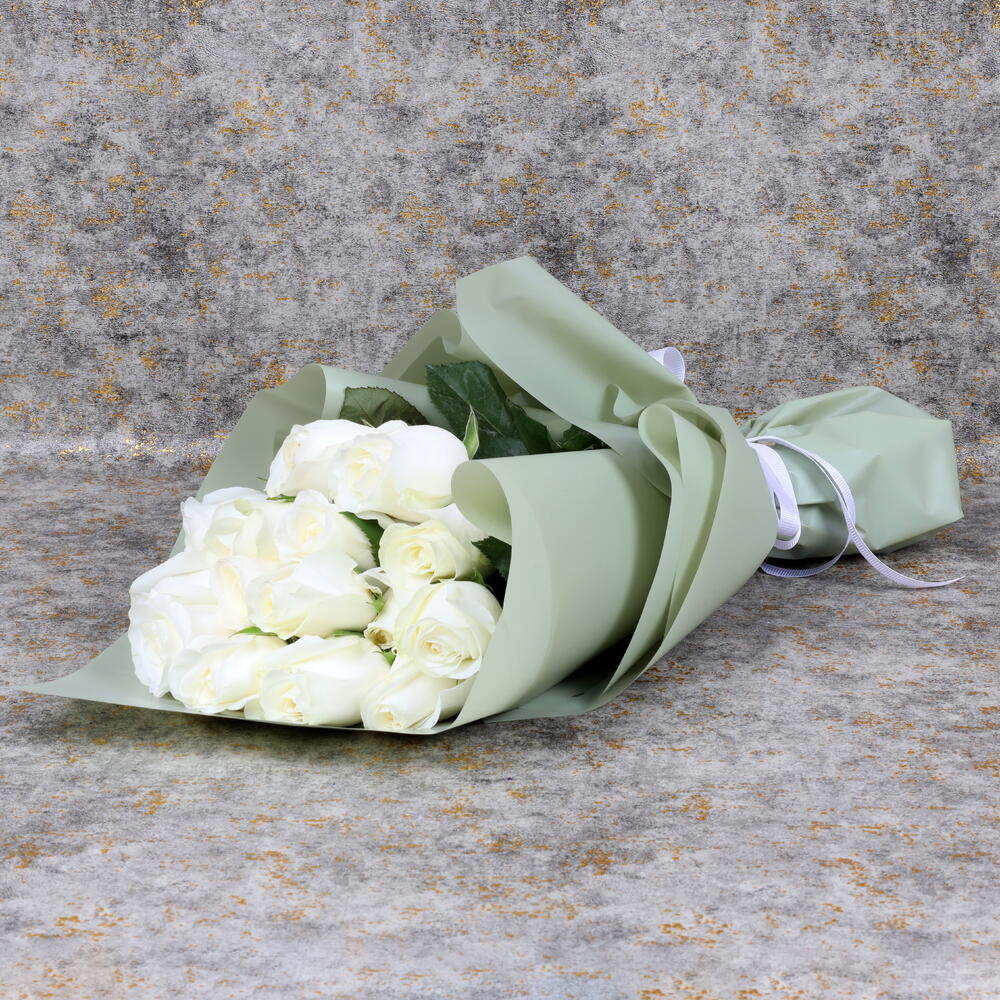 15 rosas blancas Hermosamente envueltas en envoltorio de color gris Atadas con cinta rosa