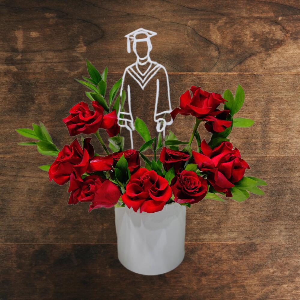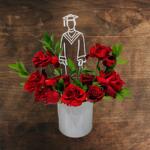 Este arreglo floral de temática de graduación con rosas rojas intensas y exuberante follaje es vibrante, elegante y festivo.