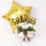 "Detalles del producto: 4 tallos de claveles rosa claro. 4 tallos de rosas blancas. 2-3 tallos de hojas verdes de Parvifolia. Atado con cinta de grosgrain rosa claro. Hermosamente hecho a mano en un jarrón cuadrado de vidrio de 10x10 cm. 1 globo metalizado de graduación y etiqueta."