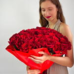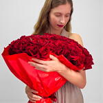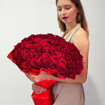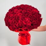 Causa una impresión inolvidable con este impresionante ramo de 101 rosas rojas premium, atadas a mano y envueltas en elegante papel rojo. 101 rosas rojas frescas y aterciopeladas, cada flor cuidadosamente seleccionada por su vibrante color y belleza. Elegante envoltorio rojo: crea una presentación romántica y audaz. Hecho a mano y arreglado profesionalmente, diseñado para un impacto máximo. Un símbolo atemporal de pasión, amor y compromiso, este gran arreglo es perfecto para propuestas de matrimonio, aniversarios, San Valentín o cualquier celebración romántica emotiva. Encarga hoy mismo el Ramo Gran Devoción y haz que tu amor sea inolvidable con un regalo impresionante que dice más que mil palabras.
