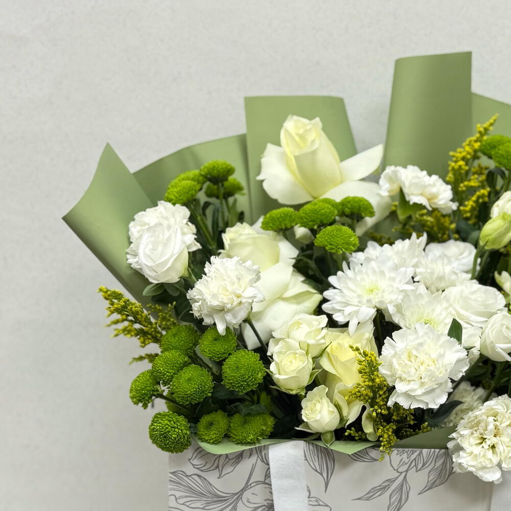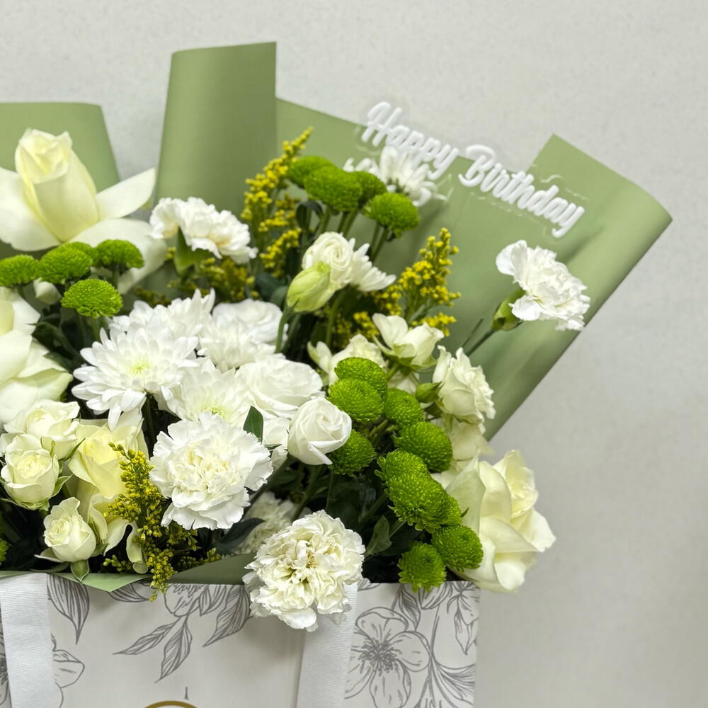 rose - 10 ud. carnation - 10 ud. batón verde - 5 ud. crysimtemm - 5 ud.
