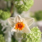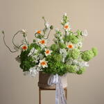 En el ramo Amantes Verdes, el viburno ocupa el lugar central con su frondoso follaje, proporcionando un telón de fondo verde para las demás flores.