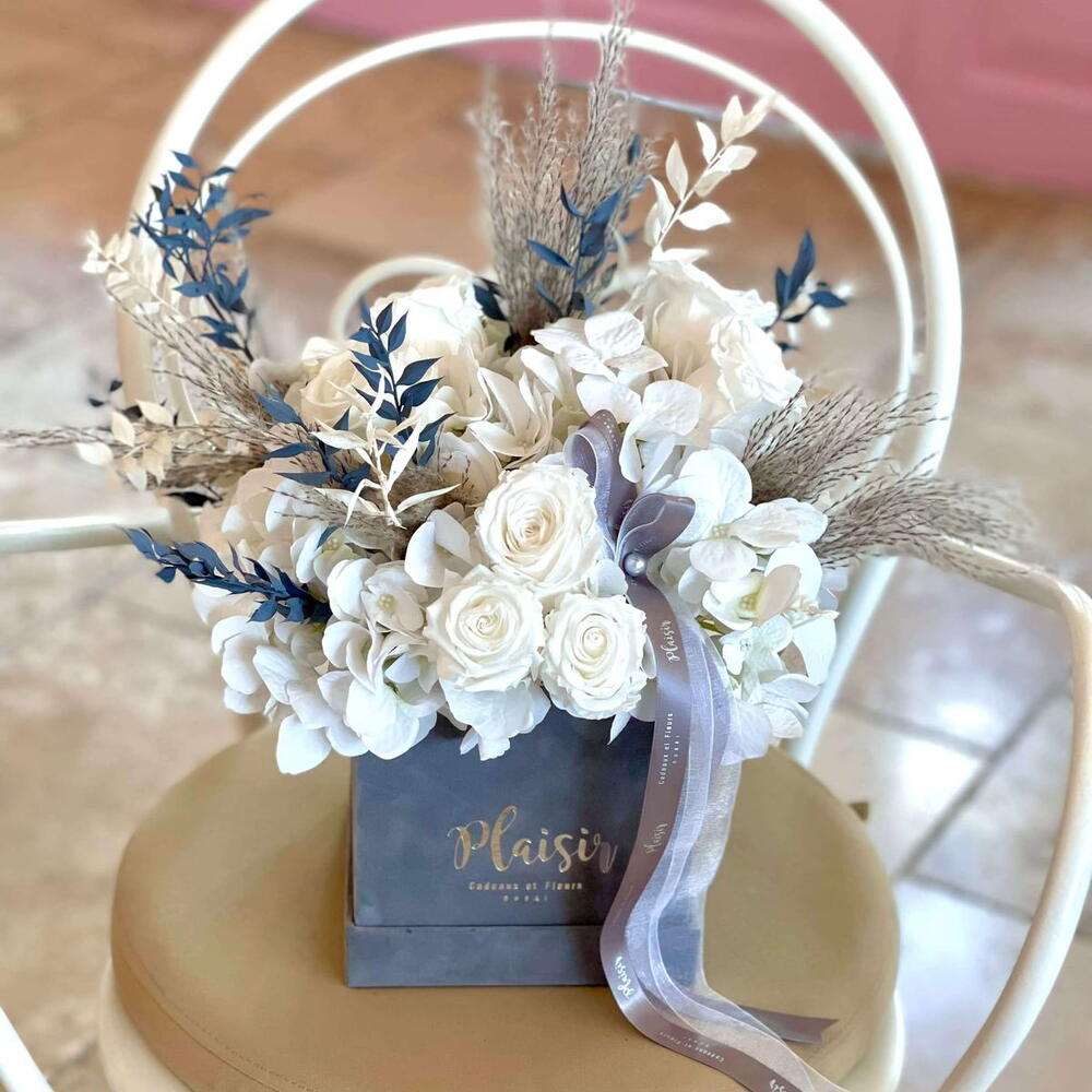 Un lujo absoluto, esta hermosa caja de terciopelo contiene una mezcla de Infinity Rose, también conocida como Forever Rose o Preserved Rose, flores secas y de seda que no se marchitan y mantienen su forma y belleza. La persona que la reciba podrá disfrutar de esta delicada belleza durante mucho tiempo y le recordará a usted todos los días del año!