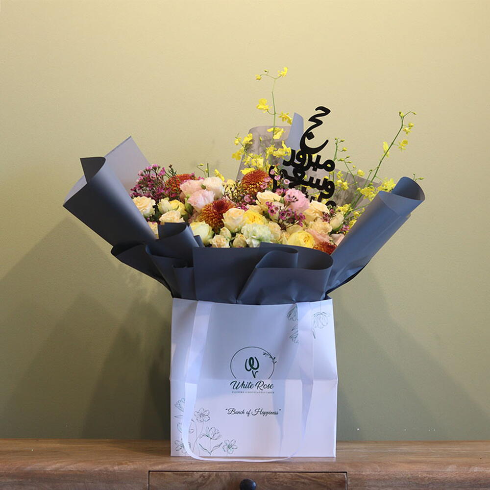 Un ramo de rosa bebé, lisianthus, Dancing Lady y otras flores.