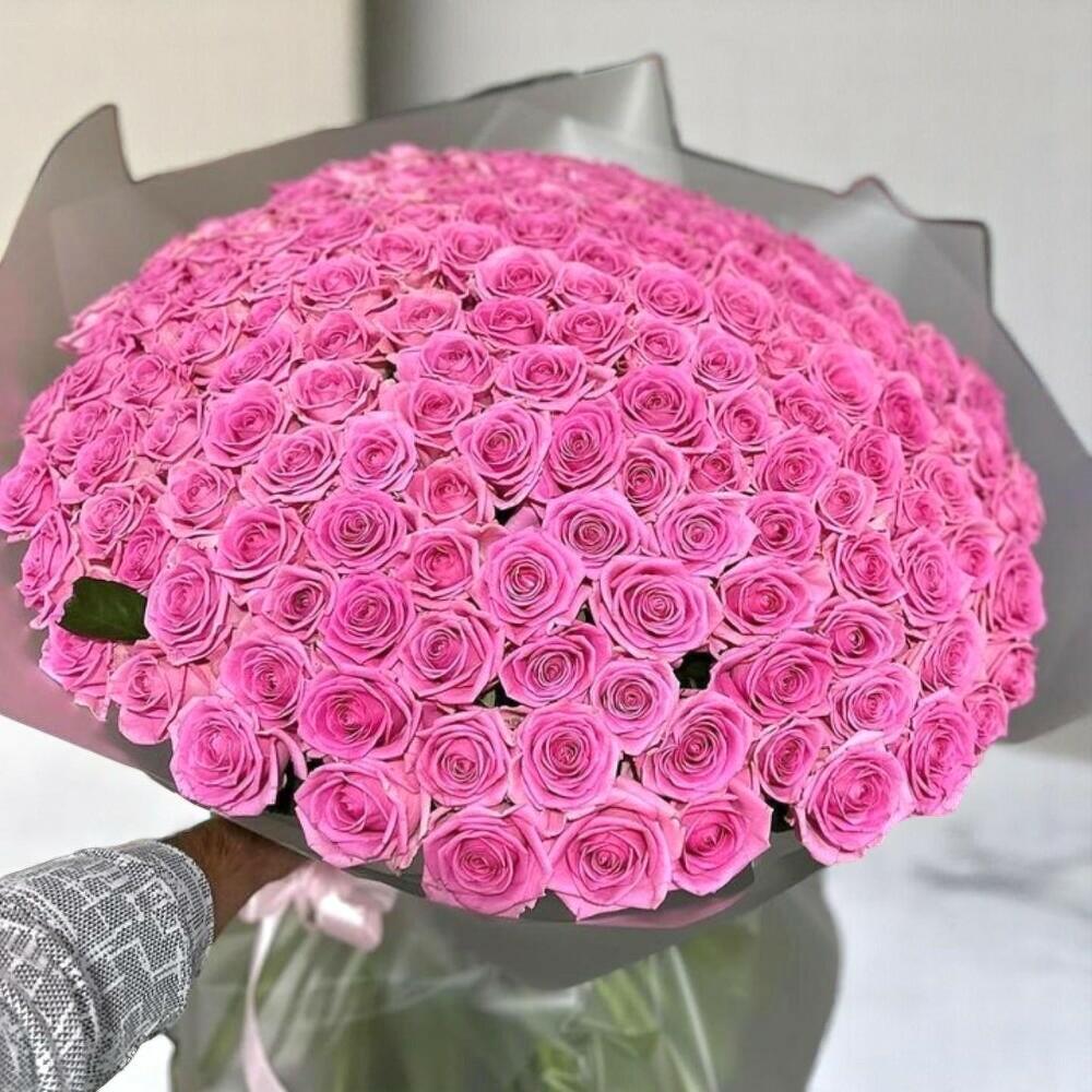 Ramo Hama con 99 rosas de color rosa oscuro – lujoso gran arreglo de rosas en envoltorio plateado