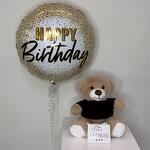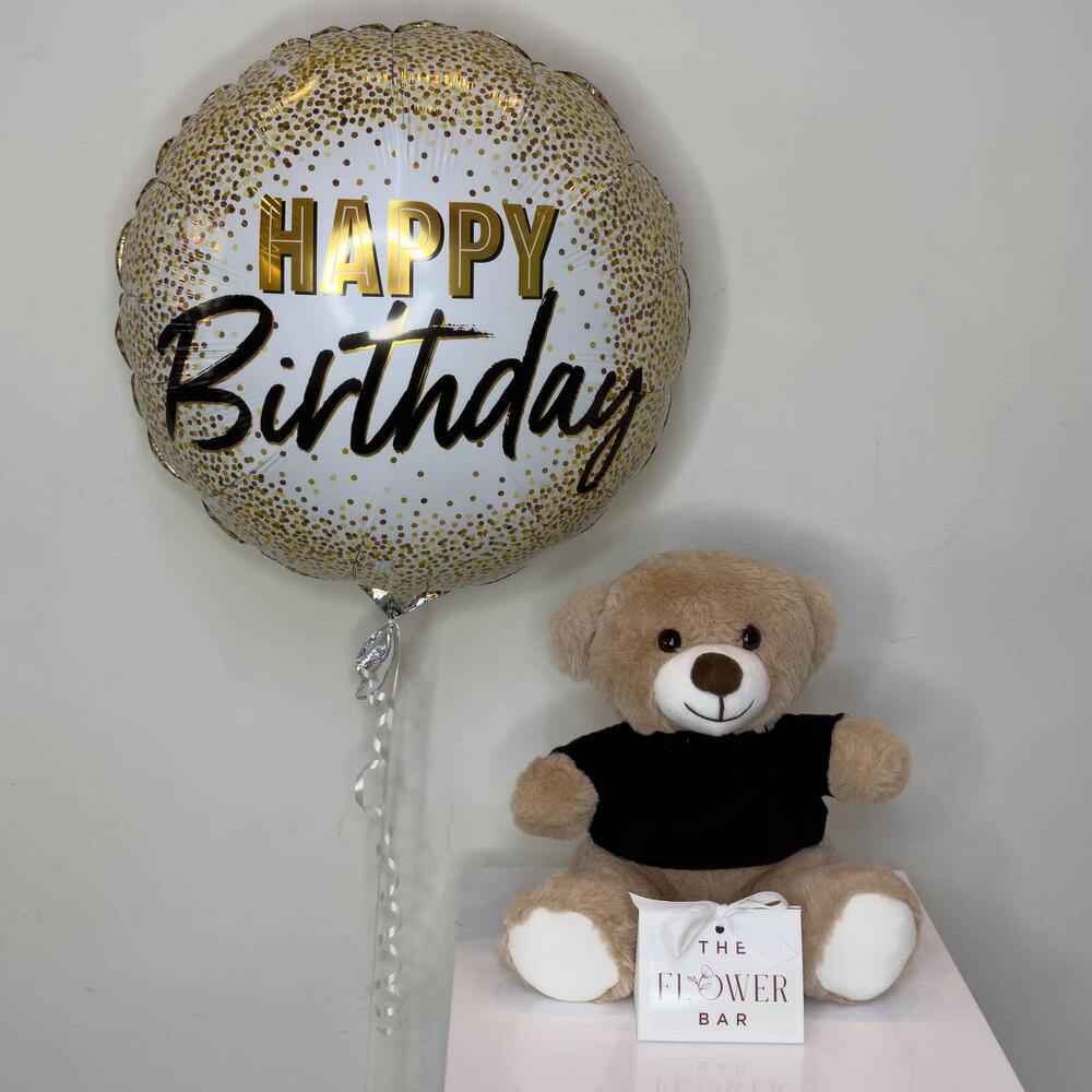 Añade a tus flores un globo de foil con helio 'Feliz cumpleaños', una caja pequeña con 4 bombones surtidos y un osito de peluche suave para completar el regalo perfecto