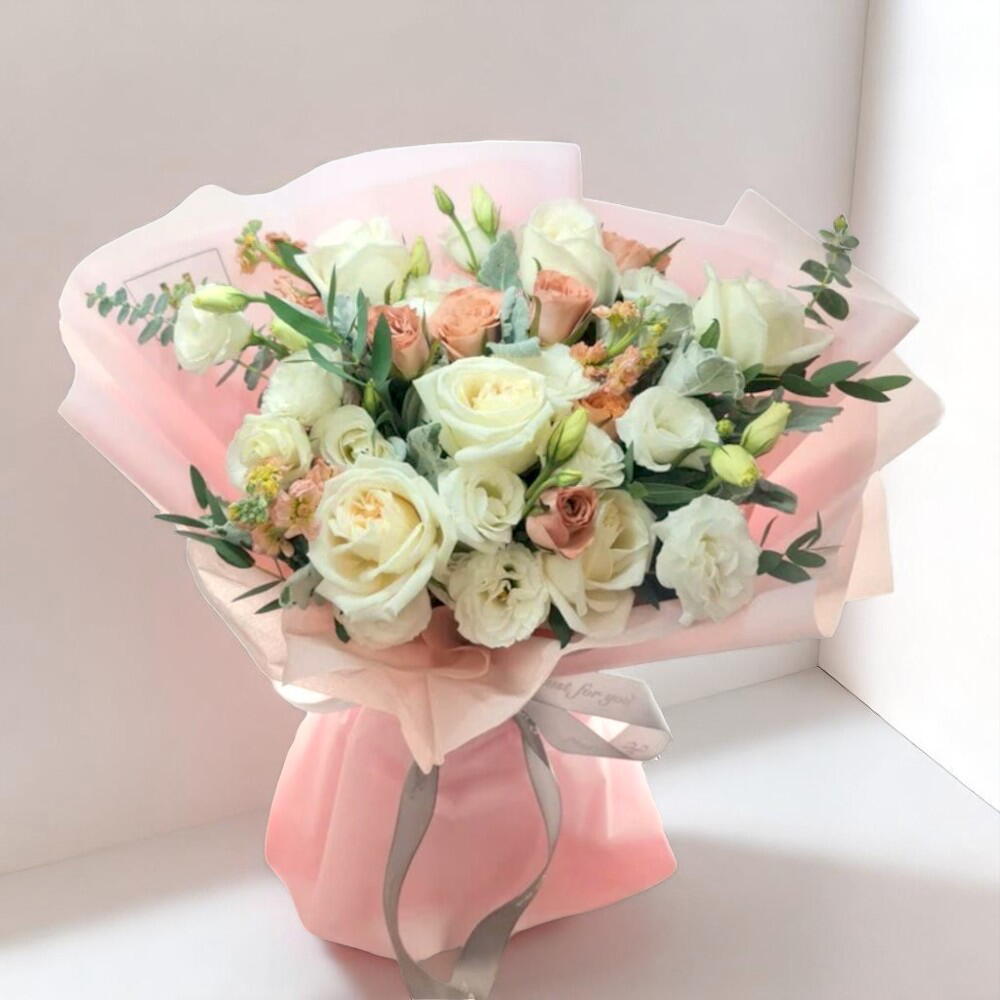 Este delicado ramo captura la esencia de la elegancia atemporal y el encanto suave. Con rosas blancas cremosas, pequeñas rosas spray en tono durazno suave y sutiles flores de lisianthus, emana un suave toque romántico perfecto para bodas, aniversarios o simplemente para decir “eres especial”. El envoltorio rosa pálido y la cinta de satén le dan un acabado elegante y pulido. Para mantener su belleza, coloque el ramo en agua fresca, cortando los tallos en diagonal. Cambie el agua cada dos días y manténgalo alejado de la luz solar directa o de fuentes de calor.
