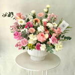 Solidago - 3 ud. Pink rose - 2 ud. clavel blanco - 5 ud. carnation pink - 3 ud. lisianthus white - 4 ud. rosa bebé - 5 ud. jarrón blanco - 1 ud. gerbera blanca - 2 ud. hermosa rosa - 4 ud. astromelia rosa - 1 ud. gerbera melocotón - 1 ud. rosas blancas - 3 ud. matiola blanca - 1 ud.