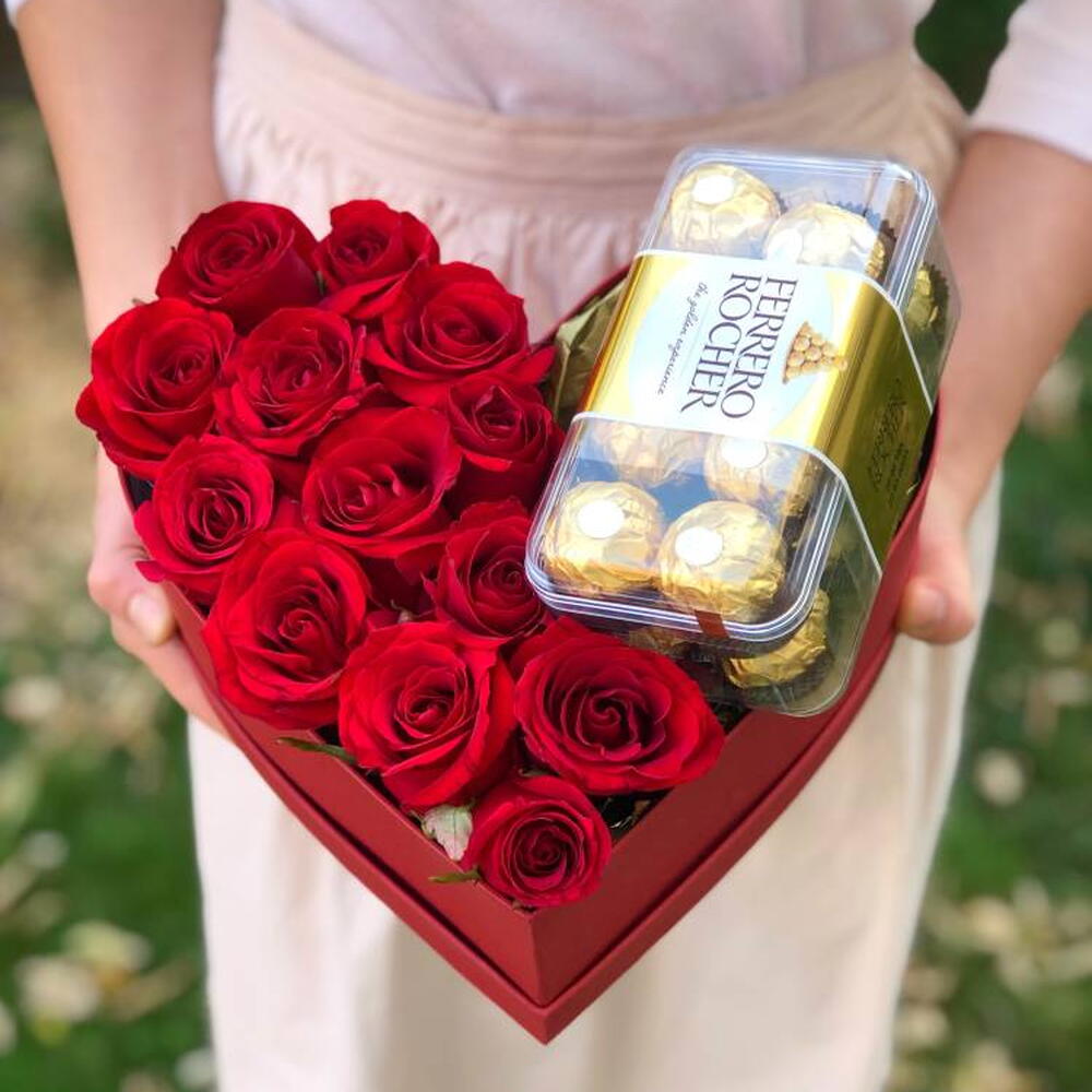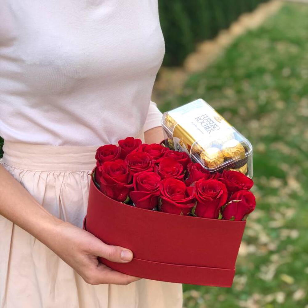 Composición: Rosas rojas - 13, bombón Ferrero Rocher - 1, caja - 1, Oasis - 1 Dimensiones: ANCHO - 26CM; ALTURA - 12CM; LARGO - 25CM; (incluye embalaje) Tamaño: 26 x 12 x 25 cm