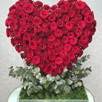 Luxurious heart-shaped arrangement featuring 141 red roses and 10 green leaves, perfect for romantic celebrations and unforgettable expressions of love.