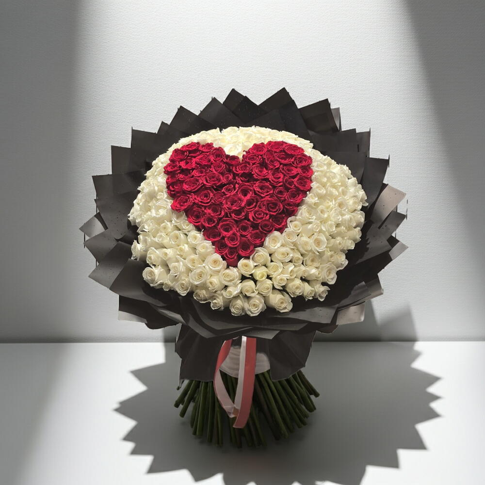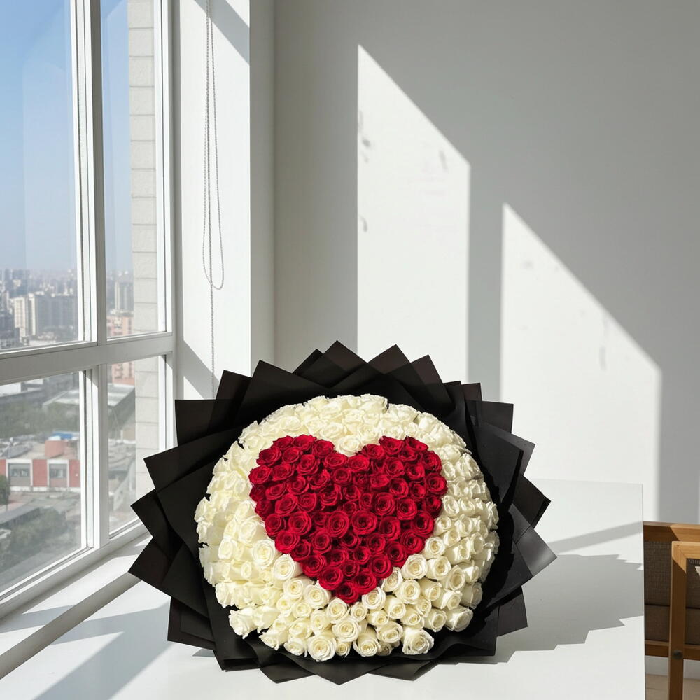 Expresa un amor profundo y pasión con nuestro impresionante ramo de flores blancas que presenta un corazón de flores rojas en su centro. Cada flor está seleccionada a mano y cuidadosamente arreglada para crear una exhibición impactante y romántica. Perfecto para aniversarios, el Día de San Valentín o gestos especiales, este ramo combina hermosamente la pureza, el amor y las emociones sinceras en cada flor.
