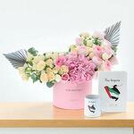 hortensia rosa - 1 ud. tallos de eucalipto - 3 ud. pink roses - 13 ud. rosas spray blancas - 7 ud. rosas en spray color melocotón - 7 ud. hojas secas pintadas a mano - 2 ud. “tú inspiras” taza de cerámica - 1 ud. “tú inspiras” diario - 1 ud.
