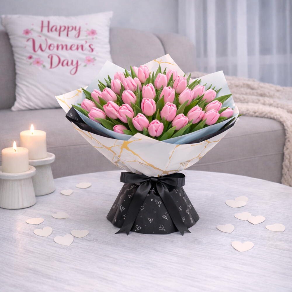 Des - Hermoso ramo de 35 tulipanes rosas en envoltura azul lisa, de mármol blanco y con corazones negros, atado con un lazo de cinta negra