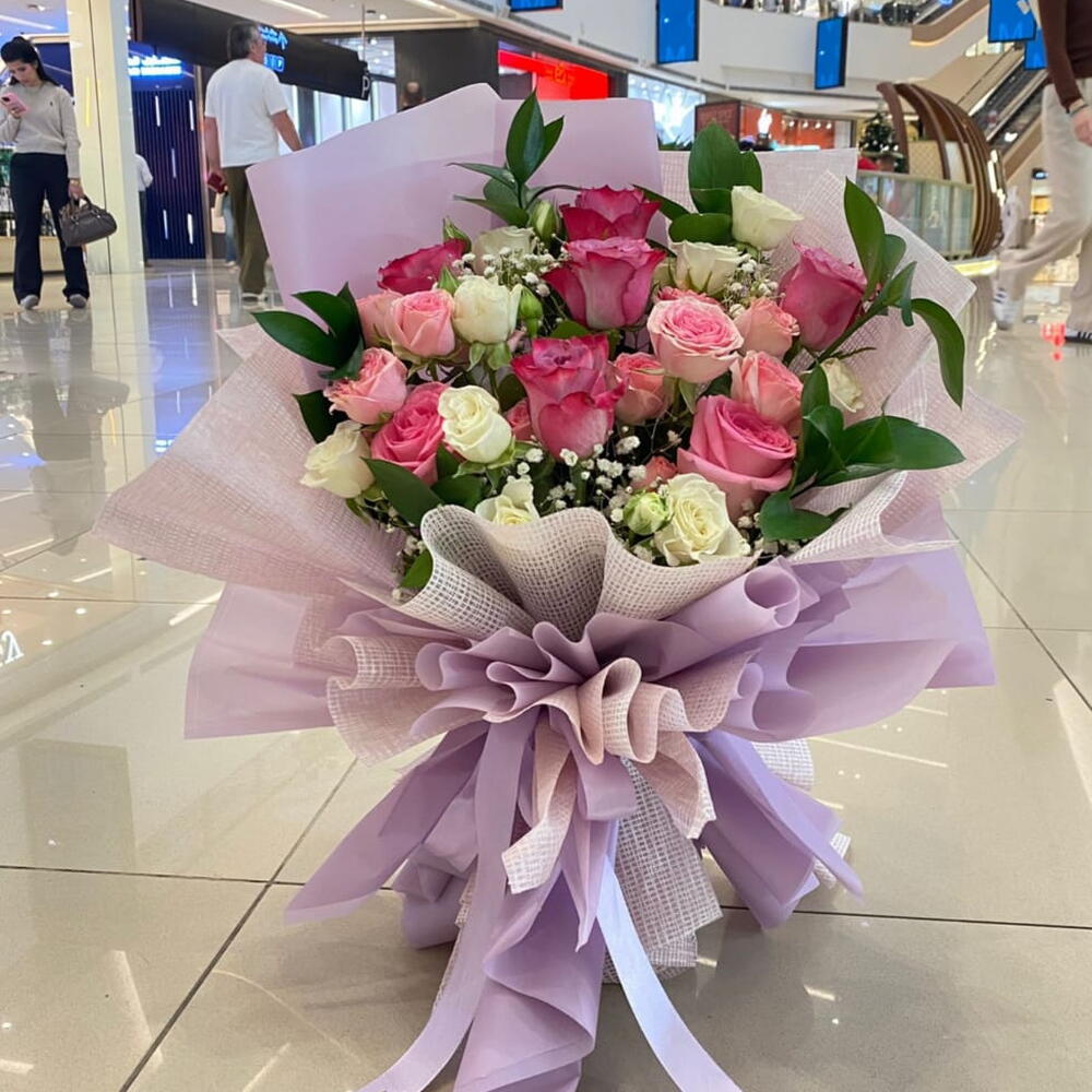 This bouquet is a wonderful and colorful gift. It uses a mix of purple and pink roses to create a happy look that is sure to make anyone smile. It is a perfect choice for celebrating a special day or just saying hello. Key Features Beautiful Colors: The blend of purple, pink, and baby pink roses creates a bright and cheerful style. Fresh Lively: Green ruscus leaves and white babys breath (Gypsophila) make the bouquet look fresh and full. Perfect Gift: This bouquet is wrapped beautifully in purple paper to match the lovely flowers. Item Compositions We put this lovely bouquet together with: Purple Roses: 5 PCs Pink Roses: 2 PCs Baby Pink Roses: 2 PCs Baby White Roses: 2 PCs Gypsophila (White Filler): 1 PC Single Ruscus Leaves: 4 PCs