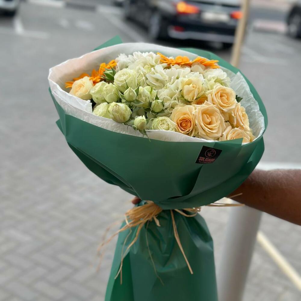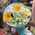 HORTENSIA 2 GERBERA 2 ROSAS SPRAY 6 CRISANTEMO 2 PAPEL DE ENVOLVER BONITO 5 EN UN RAMO