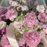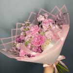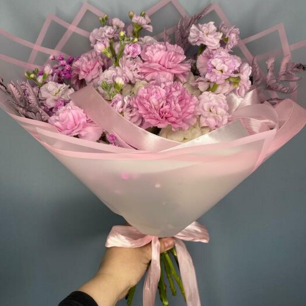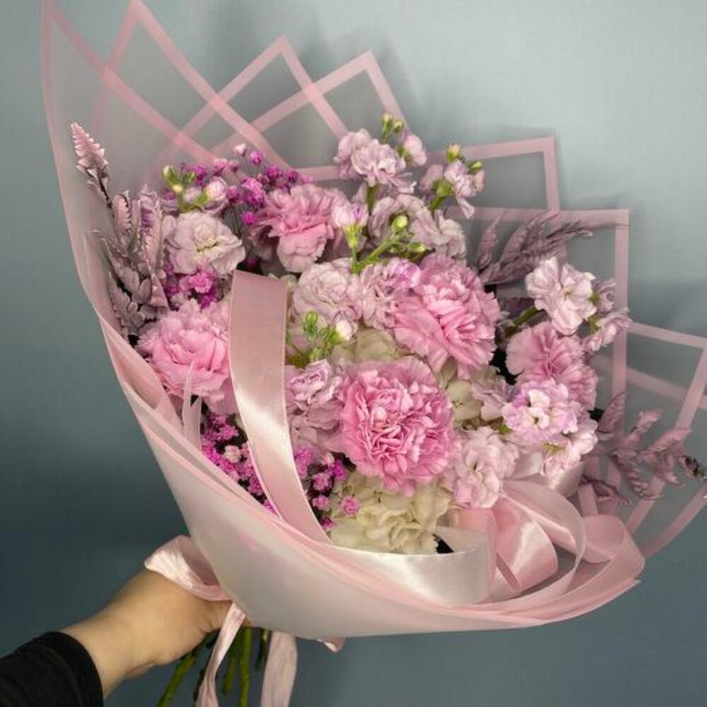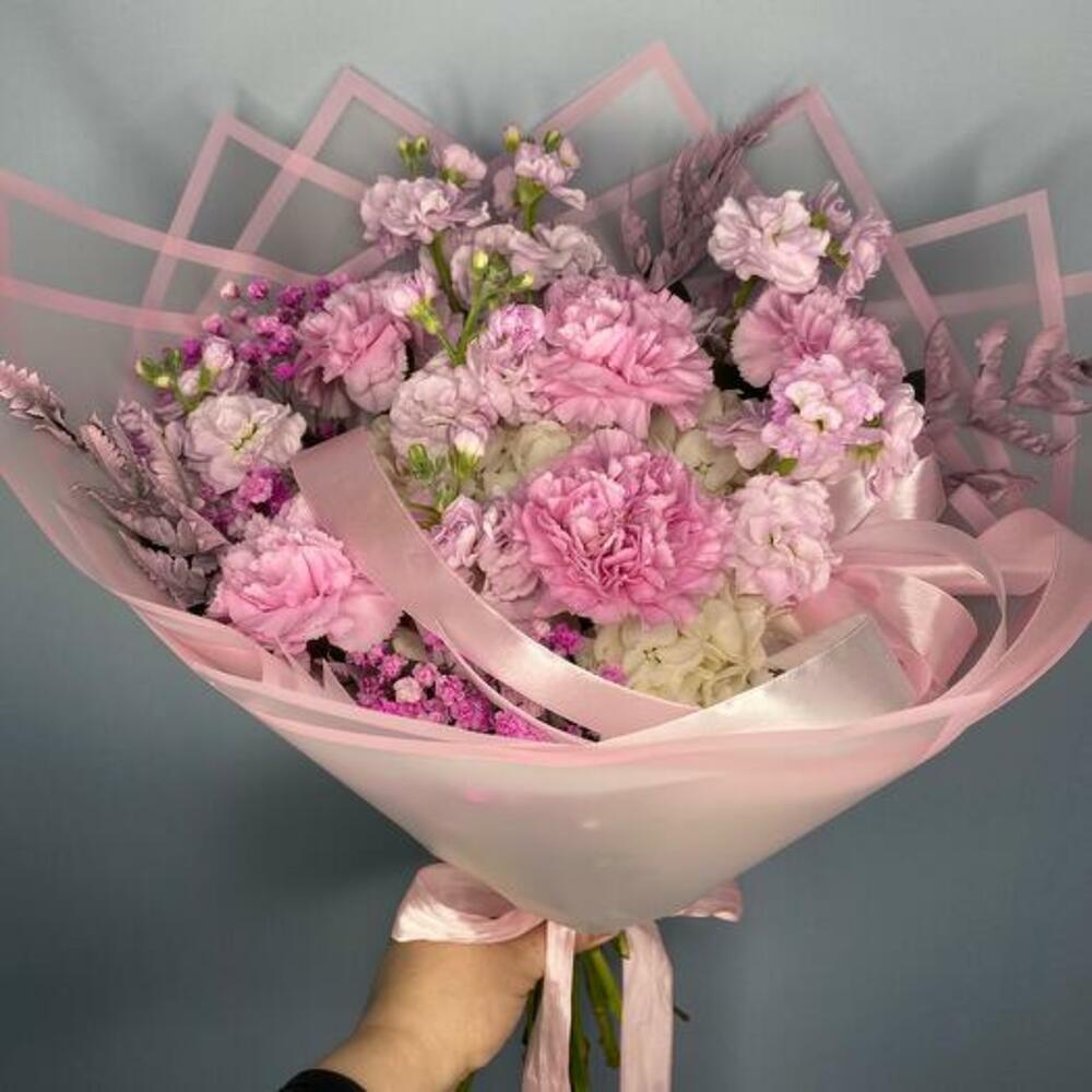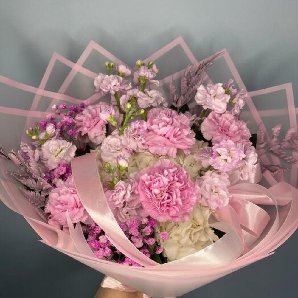 Satin ribbon - 1 ud. Gypsophila - 1 ud. matthiola - 5 ud. empaque de diseñador - 3 ud. decorative greenery - 10 ud. white hydrangea - 1 ud. clavel rosa - 5 ud.