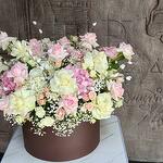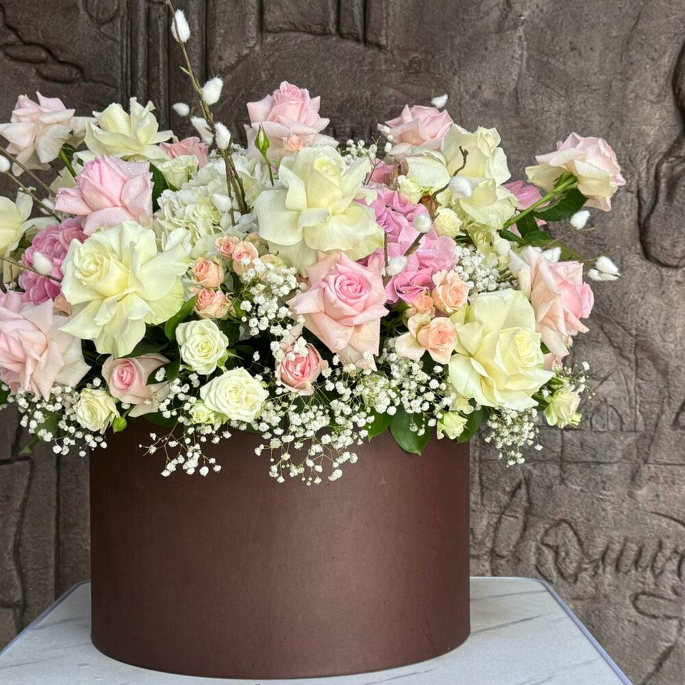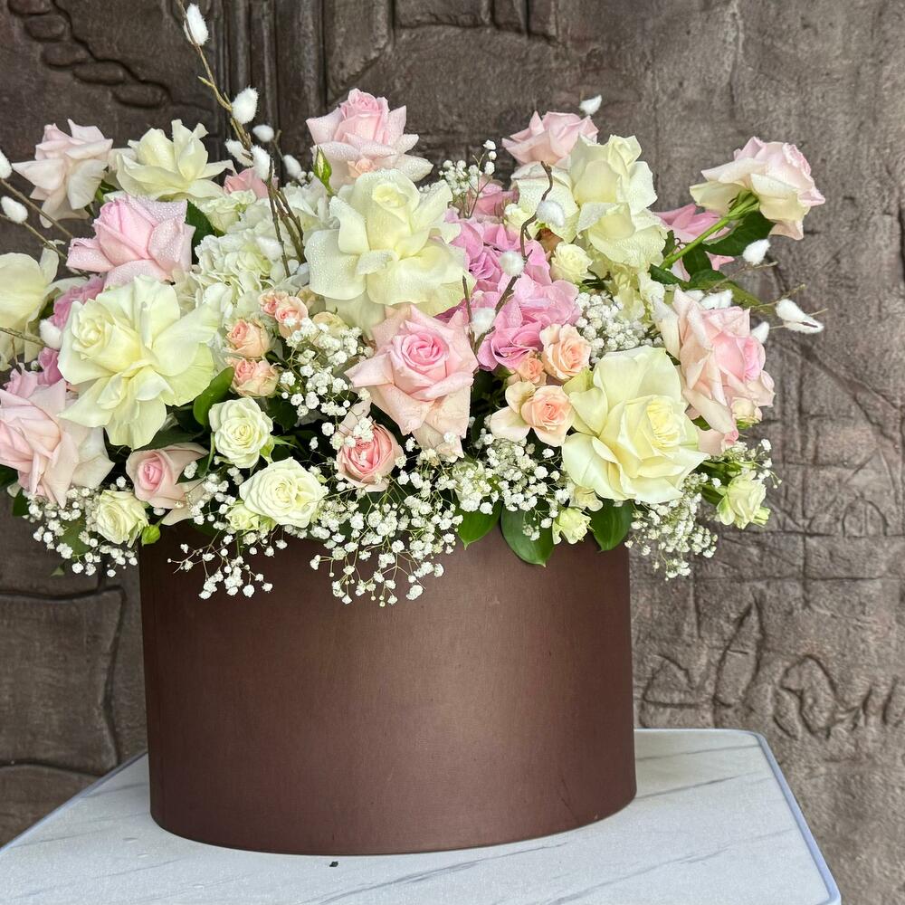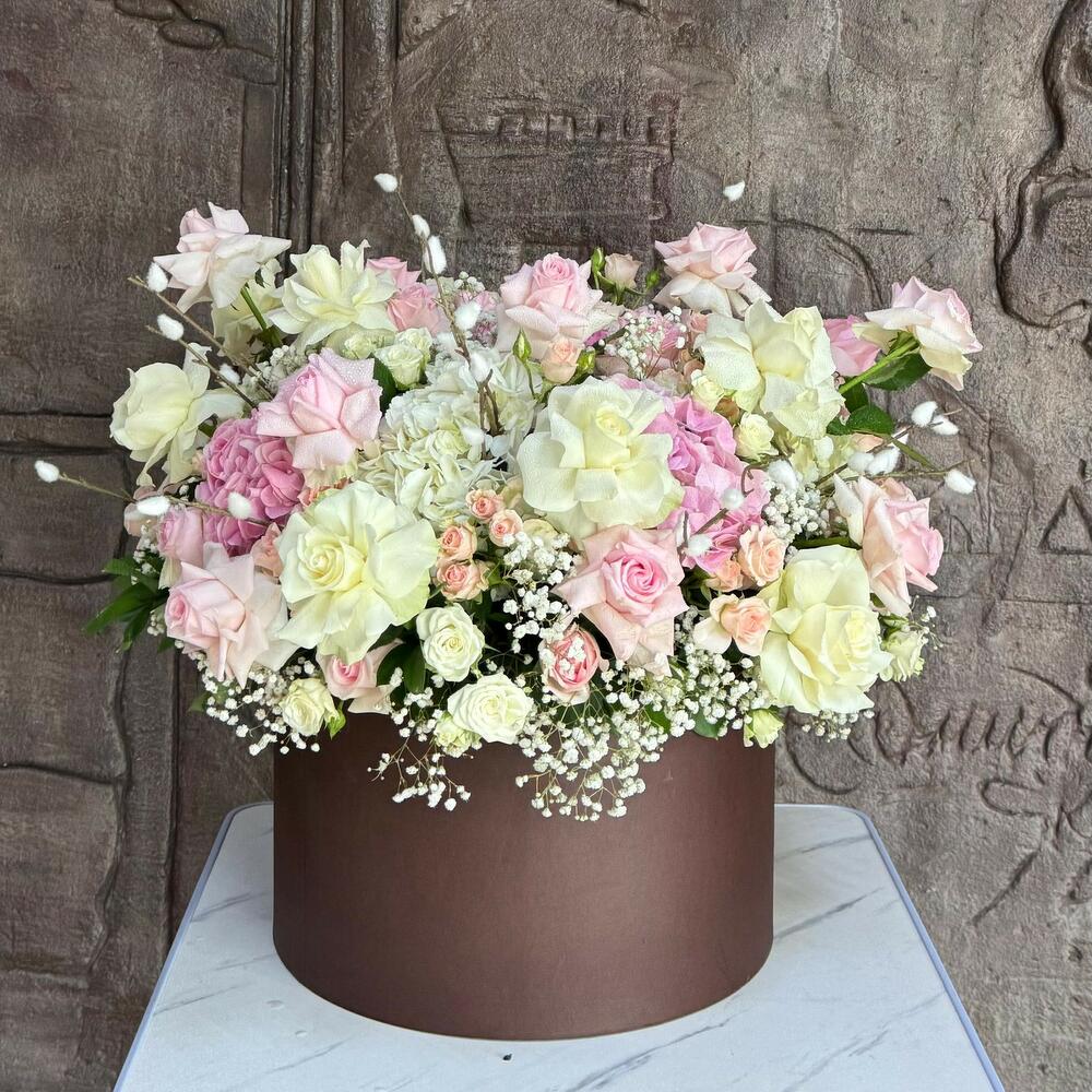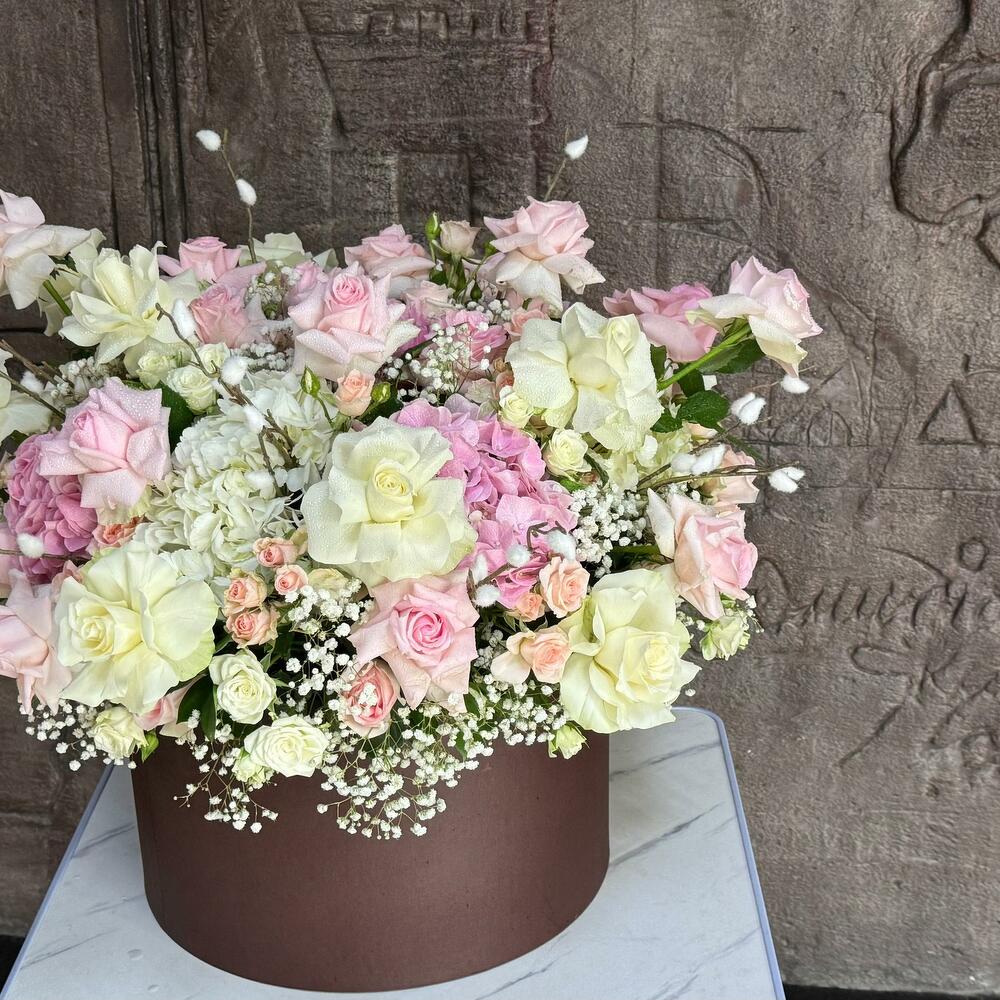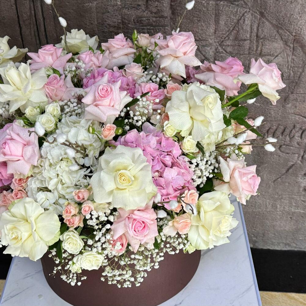 Hortensias y Rosas en Caja; Este elegante arreglo floral redondo incluye 4 hortensias blancas, 5 hortensias rosas, 12 rosas blancas, 24 rosas rosas, 10 rosas blancas en spray, 10 rosas rosas en spray, 4 varas de salak y 5 gipsóforos, todo ello bellamente complementado con rellenos verdes frescos y presentado en una caja redonda. La armoniosa combinación de blancos y rosas crea un ramo sofisticado y atemporal, perfecto para expresar amor, admiración o celebrar cualquier ocasión especial.