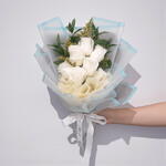 Este elegante ramo presenta 7 rosas blancas inmaculadas, que simbolizan pureza y amor, dispuestas delicadamente con follaje fresco y pequeños toques amarillos. El ramo está envuelto en suave papel de seda azul y amarillo translúcido, con una bonita cinta que lo sujeta, creando un aspecto sofisticado y sereno. La combinación de colores y texturas suaves lo convierte en un regalo perfecto para ocasiones especiales como cumpleaños, aniversarios o para expresar admiración y afecto. Emana simplicidad y elegancia, lo que lo convierte en un gesto ideal para cualquier momento romántico o para mostrar cariño. Para su cuidado, cambie el agua con regularidad y recorte los tallos aproximadamente 1 cm cada pocos días para mantenerlas frescas. Mantenga el ramo en un lugar fresco, alejado de la luz solar directa, para preservar su belleza.