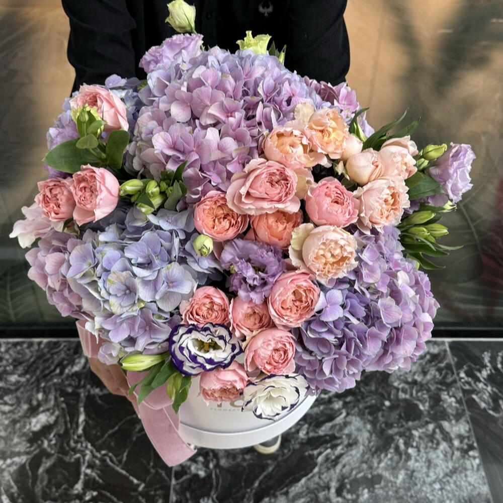 Composición: Hortensia - 5, Rosa spray Julieta melocotón - 8, Lisianthus - 5, Alstroemeria - 7, Caja redonda de marca - 1 Tamaños: ANCHO - 40CM; ALTURA - 45CM; LARGO - 45CM; (incluido el embalaje) Tamaño: 40 x 45 x 45 cm