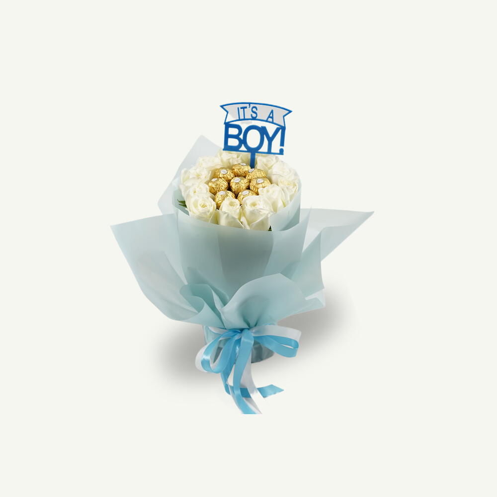 Una mezcla de 10 rosas blancas, 8 bombones Ferrero Rocher y un adorno “Es un niño” cuidadosamente elaborado en un envoltorio azul, un gesto dulce y elegante para dar la bienvenida a un recién nacido.