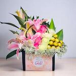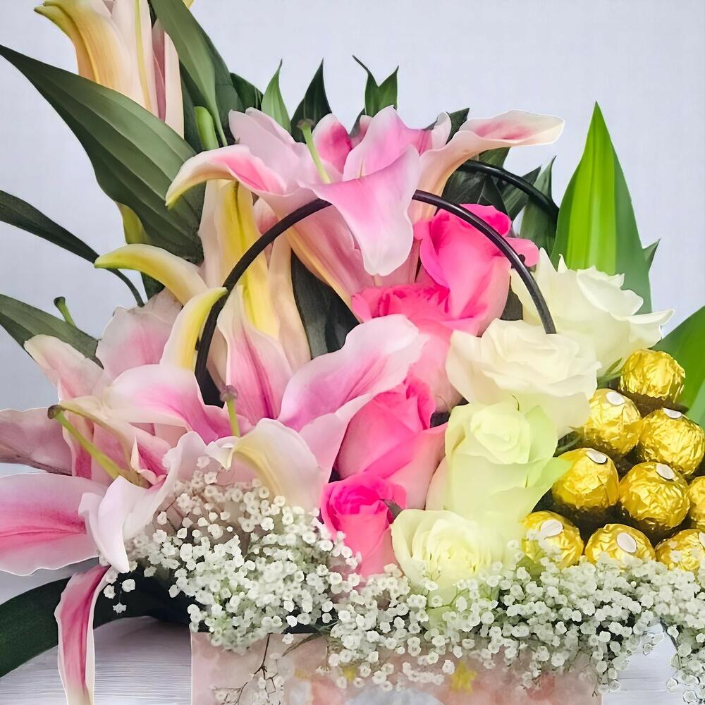 Ferrero rocher - 10 ud. lirio - 3 ud. gypso - 3 ud. bolsa estampada para niña - 1 ud. espuma oasis - 1 ud. roses - 8 ud.
