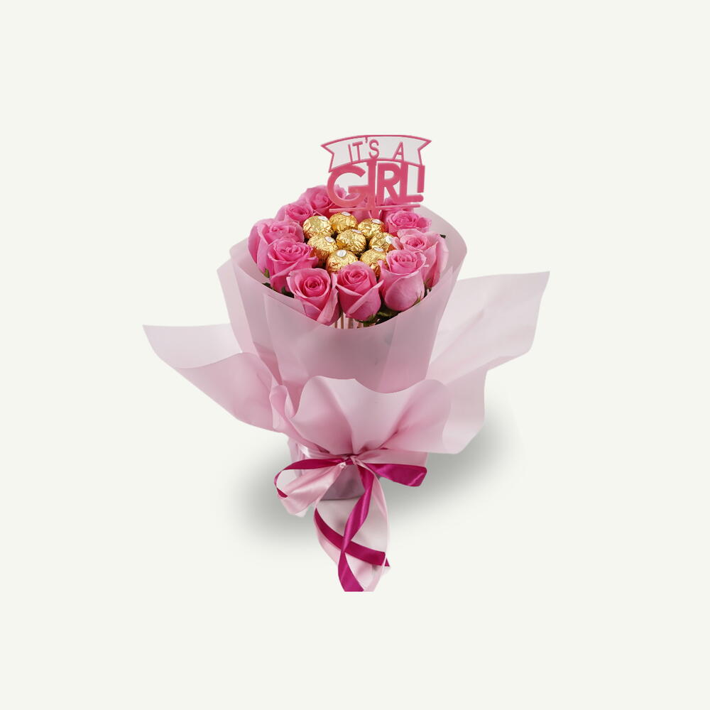 Una mezcla de 10 rosas rosadas, 8 bombones Ferrero Rocher y un adorno «¡Es una niña!» cuidadosamente elaborado en un envoltorio rosa, un regalo encantador y considerado para celebrar su llegada.