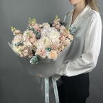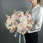 Las hortensias rosa claro y la matthiola color melocotón crean una base cálida y acogedora, mientras que las rosas blancas Ohara y los claveles añaden contraste. Los suaves tonos melocotón y rosa evocan un cálido abrazo, mientras que el eucalipto aporta un toque refrescante. Un ramo para momentos de gratitud o de serena alegría.