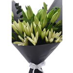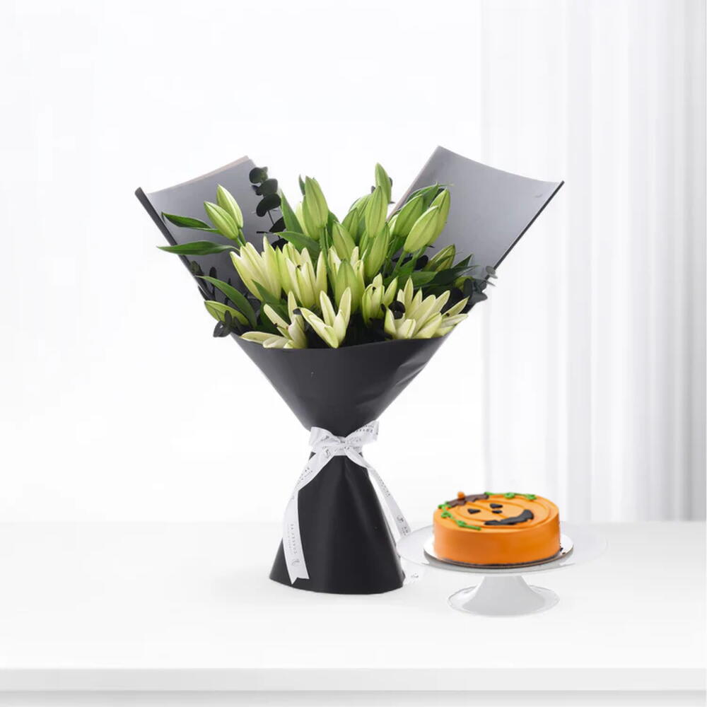 Descubra la elegancia y el encanto de nuestro Mono Bouquet con 10 impresionantes lirios blancos. El ramo está delicadamente equilibrado con 6 ramitas de misterioso eucalipto negro y 7 tallos de tierno ruscus, creando una exquisita mezcla de sencillez y elegancia. ¿Y qué sorpresa dulce sería sin un delicioso capricho? Este ramo también incluye un suculento pastel de chocolate Happy Jack de 500 g. Perfecto para un aniversario, un cumpleaños o simplemente para decir te quiero. Deleite sus sentidos y su paladar, porque algunas historias de amor se cuentan mejor con flores y una dosis de chocolate.