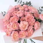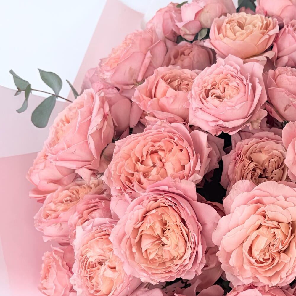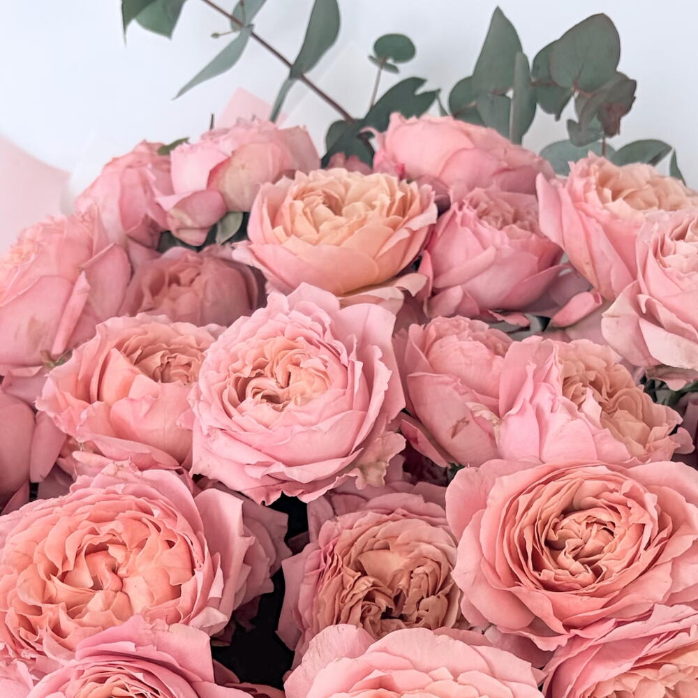 Featuring a generous cluster of 50 to 55 premium garden rose heads, Experience the perfect harmony of nature with our hand-crafted bouquet. Beautifully accented with fresh, fragrant Eucalyptus leaves for a modern and organic touch.