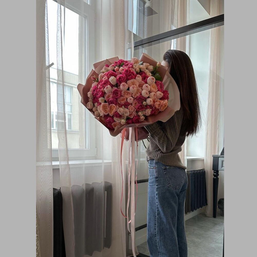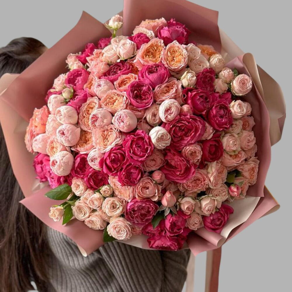 julieta rosas spray peonía en color fucsia y rosa durazno floreciendo en un ramo envuelto especial