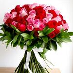 Ramo de 101 rosas rojas y rosadas con hojas de ruscus y cinta
