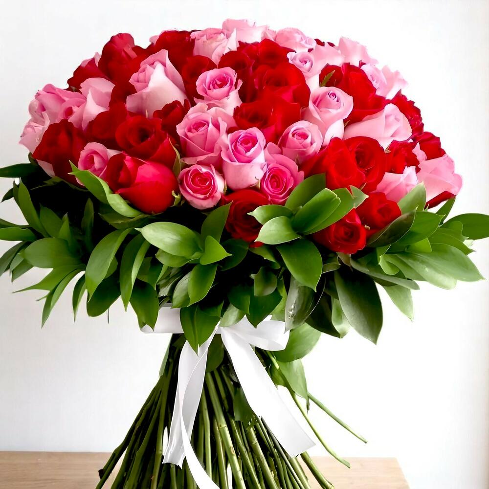 Ramo de 101 rosas rojas y rosadas con hojas de ruscus y cinta