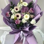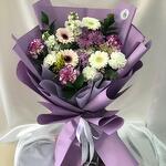 El crisantemo - 3 ud. Ferrero rocher - 1 ud. Gerbera - 4 ud. clavel blanco - 4 ud. clavel púrpura - 4 ud. matthiola - 2 ud. rusco individual - 3 ud.
