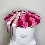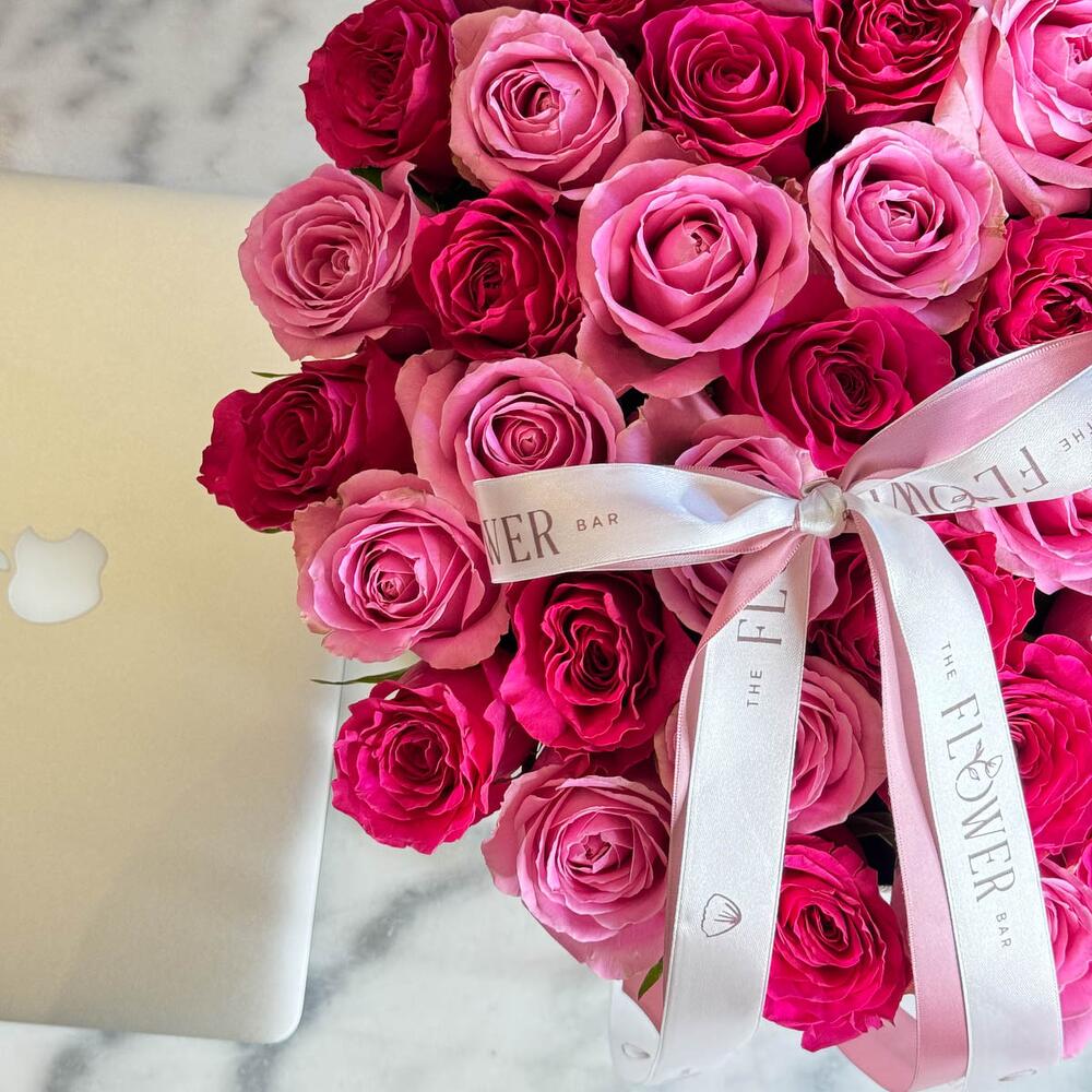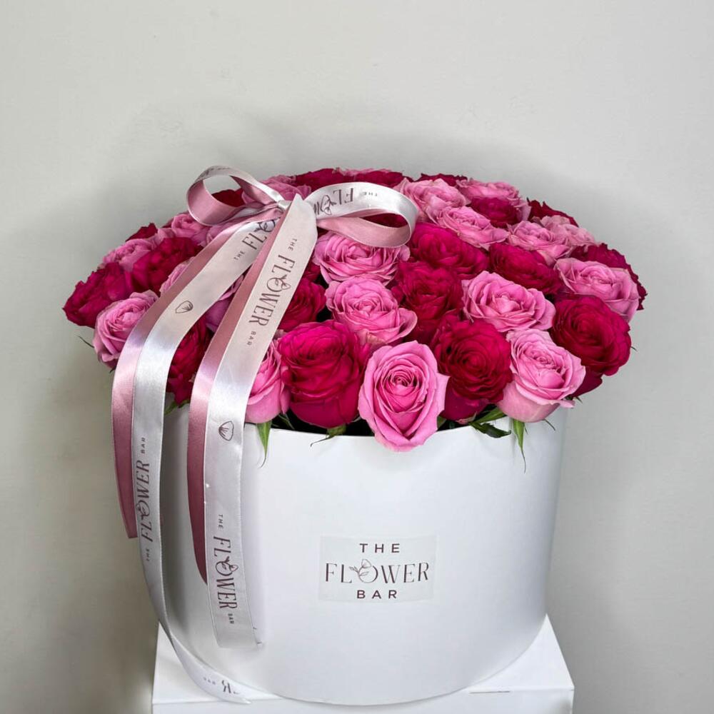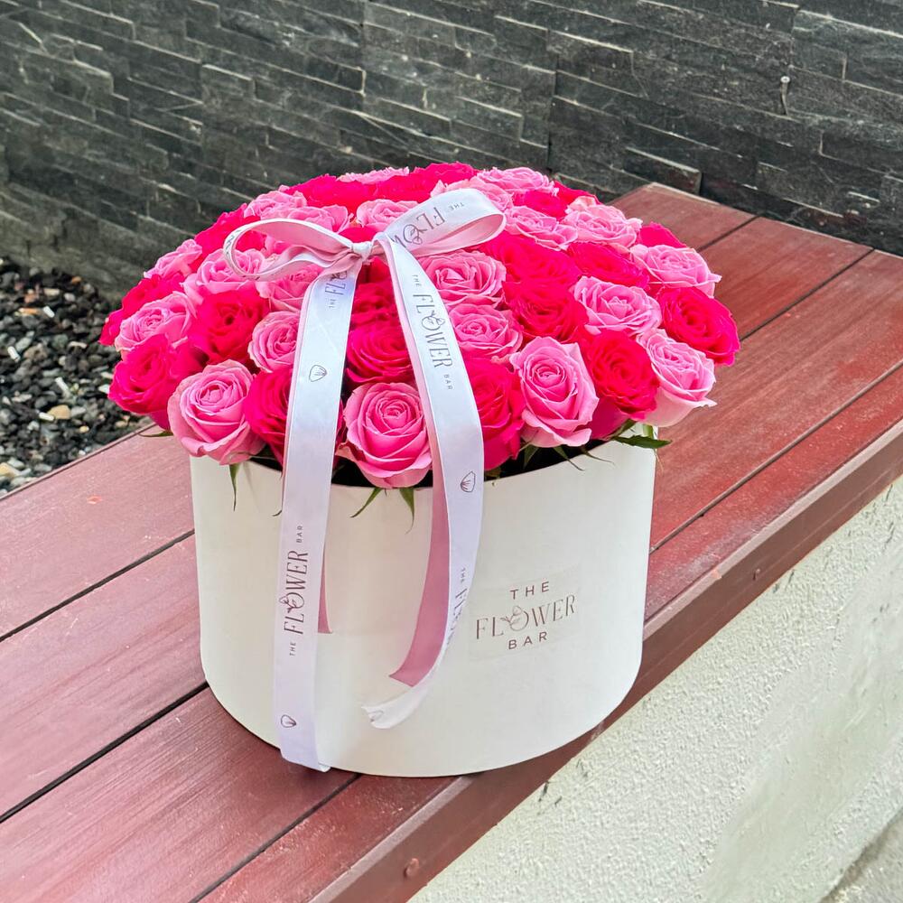 Caja blanca grande con 51 rosas mixtas en tonos rosa y rosa oscuro.