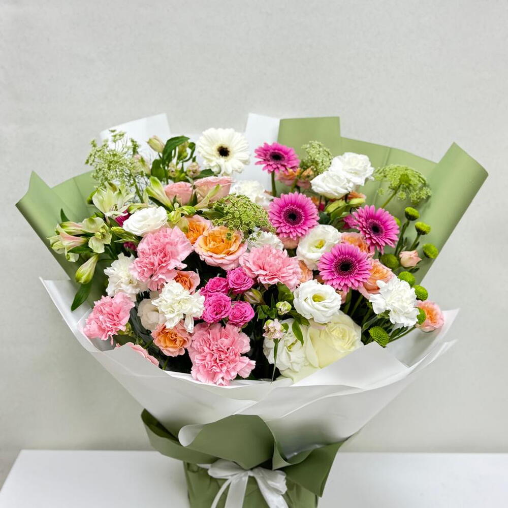 White rose - 2 ud. alstroemeria blanca - 3 ud. clavel blanco - 4 ud. carnation pink - 4 ud. lisianthus white - 4 ud. gerbera pink - 4 ud. ammi majus - 3 ud. crisantemo botón verde - 3 ud. gerbera blanca - 1 ud. bebé rosa melocotón - 3 ud. bebé rosa liana rosa - 2 ud. envoltorio blanco y verde - 1 ud.