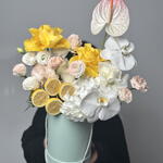 Hydrangea - 1 ud. Phalaenopsis - 2 ud. Anthurium - 1 ud. limones - 2 ud. lisianthus white - 3 ud. rosas blancas - 3 ud. rosas amarillas - 3 ud. hojas de pistacho - 3 ud.