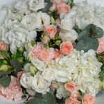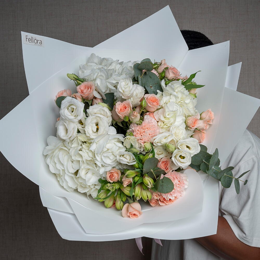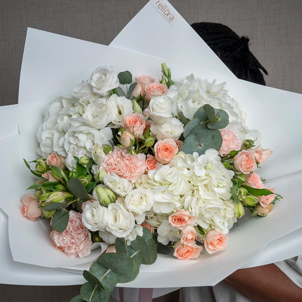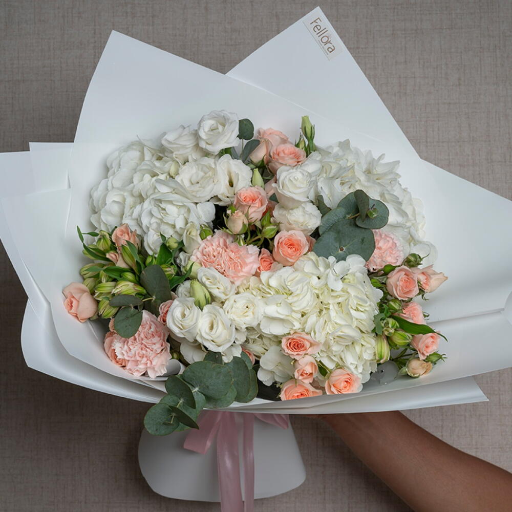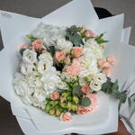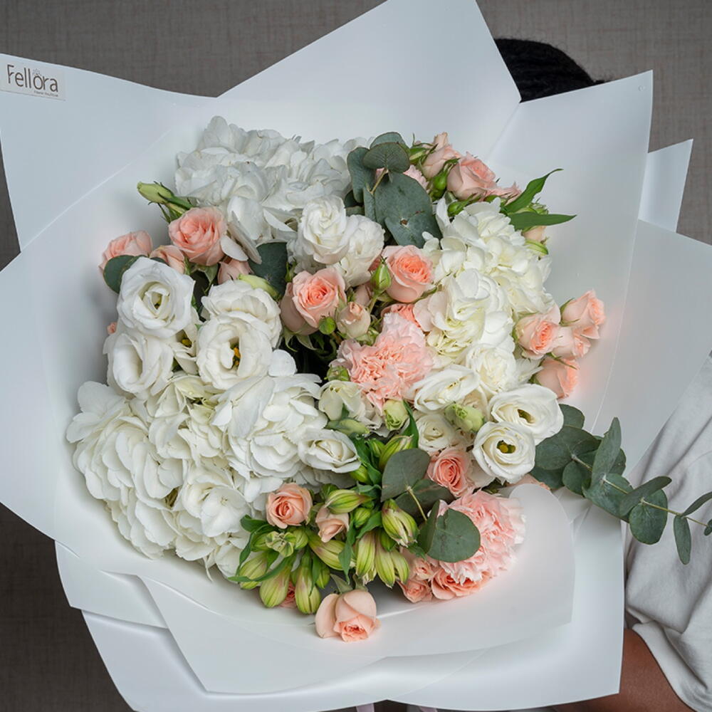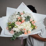 carnation pink - 3 ud. hydrangea white - 3 ud. lisianthus white - 3 ud. ribbon satin - 1 ud. eucalyptus leaves - 3 ud. sweet sara spray rose - 5 ud. decoración envoltorio - 5 ud. alstroemeria blanca - 3 ud.