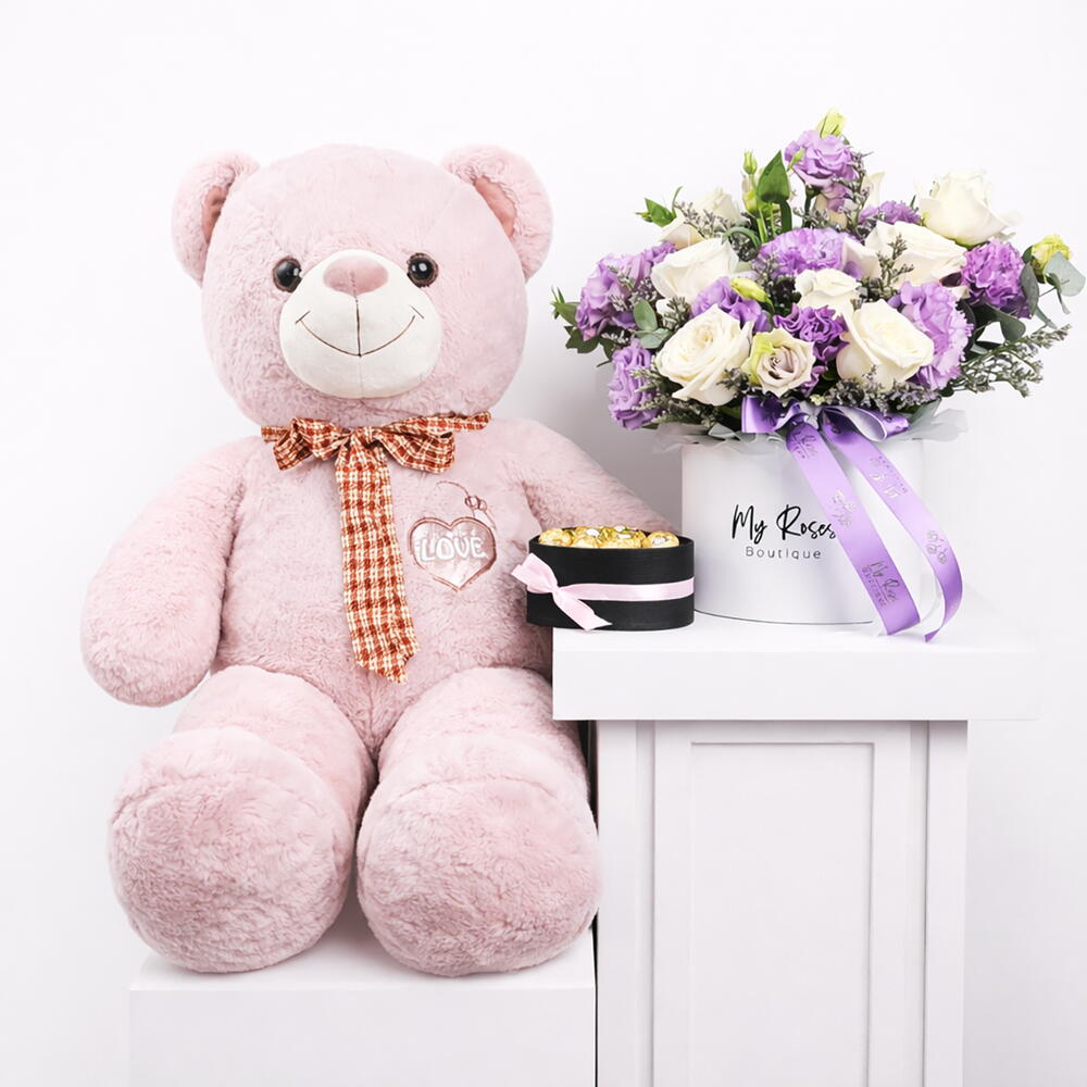 white roses 7 eustoma purple 10 limonium purple 4 eucalyptus 1 ferero in heart small box teddy bear 100 cm