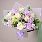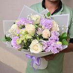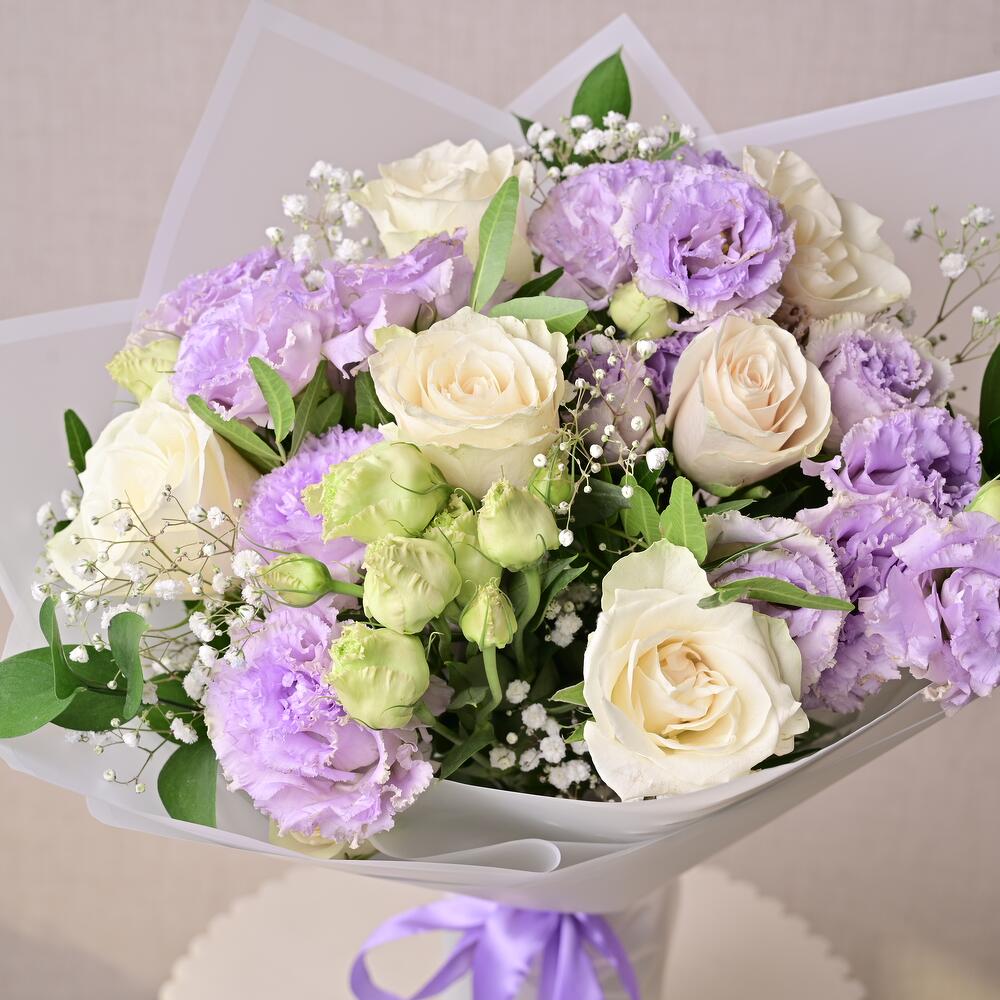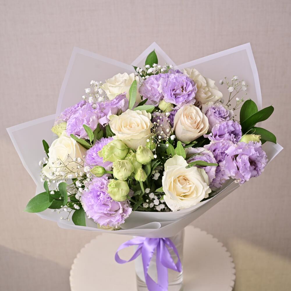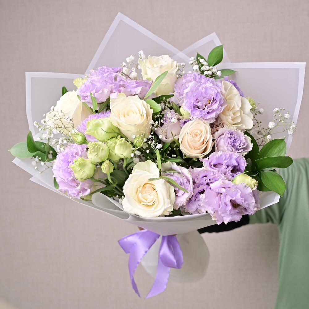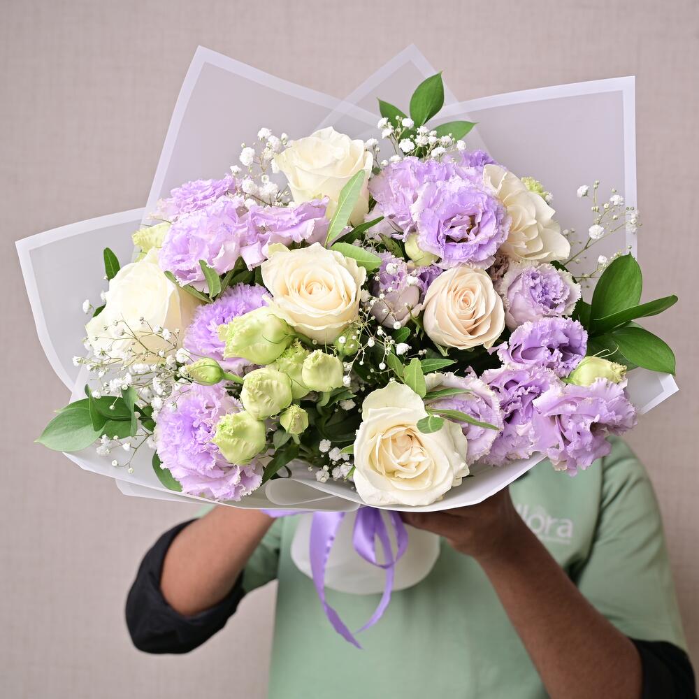 Ramo atado a mano con rosas blancas, lisianthus púrpura, gypsophila y ruscus. Ideal para aniversarios, felicitaciones y regalos florales premium.