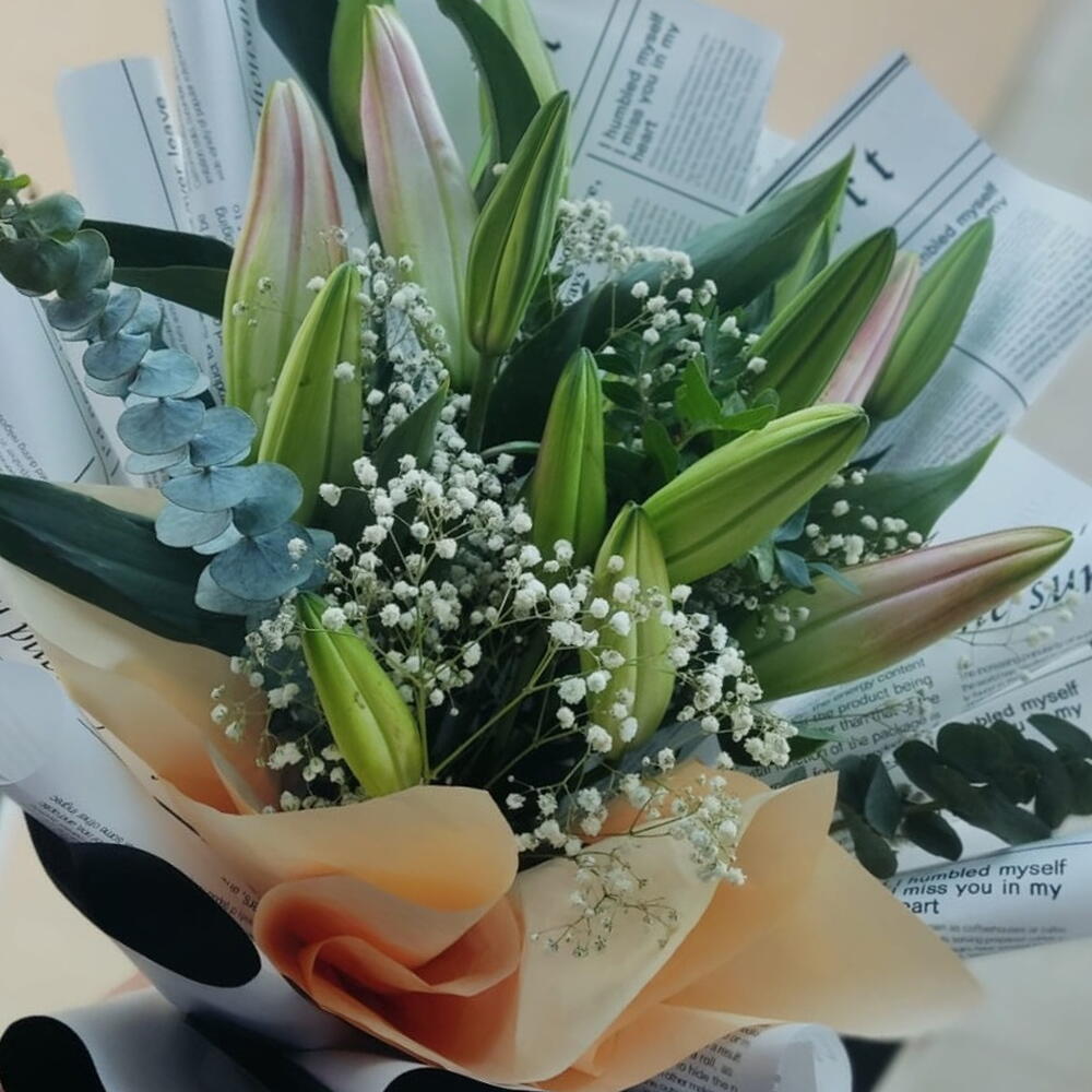 Discover the mesmerizing beauty of this exquisite bouquet from our Florists Specials. It features an enchanting blend of verdant Eucalyptus (3 pcs) artfully arrayed with the pristinely white Lily flowers (8 pcs) amidst the wilderness charm of Jipso (3 pcs). The bouquet creates a harmonious balance of natural textures and tones, offering a delightful view and a refreshing aroma. It weaves a captivating tale of elegance that leaves a memorable impression on any occasion. Whether you wish to express your eternal love or sincere wishes, this bouquet makes the perfect choice.