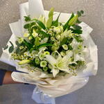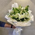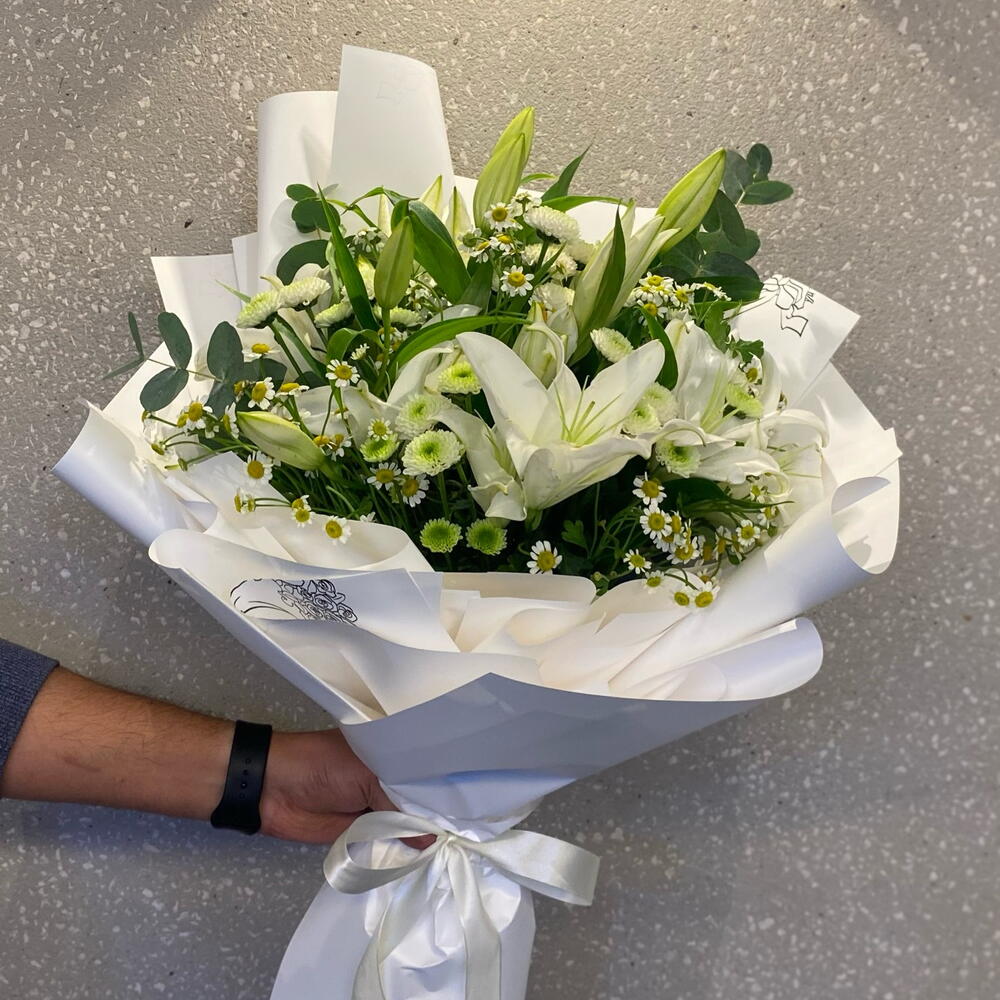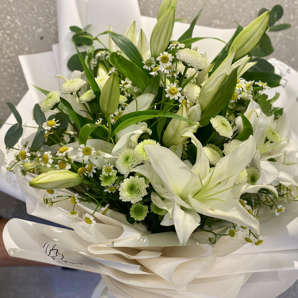 Ramo elegante de flores blancas Un arreglo delicado que incluye 4 tallos de lirios blancos, 5 tallos de crisantemo santini blanco, 6 tallos de margaritas blancas y 3 hojas de eucalipto. Envuelto en 5 capas de papel premium y rematado con una cinta color crema—perfecto para cualquier ocasión elegante.